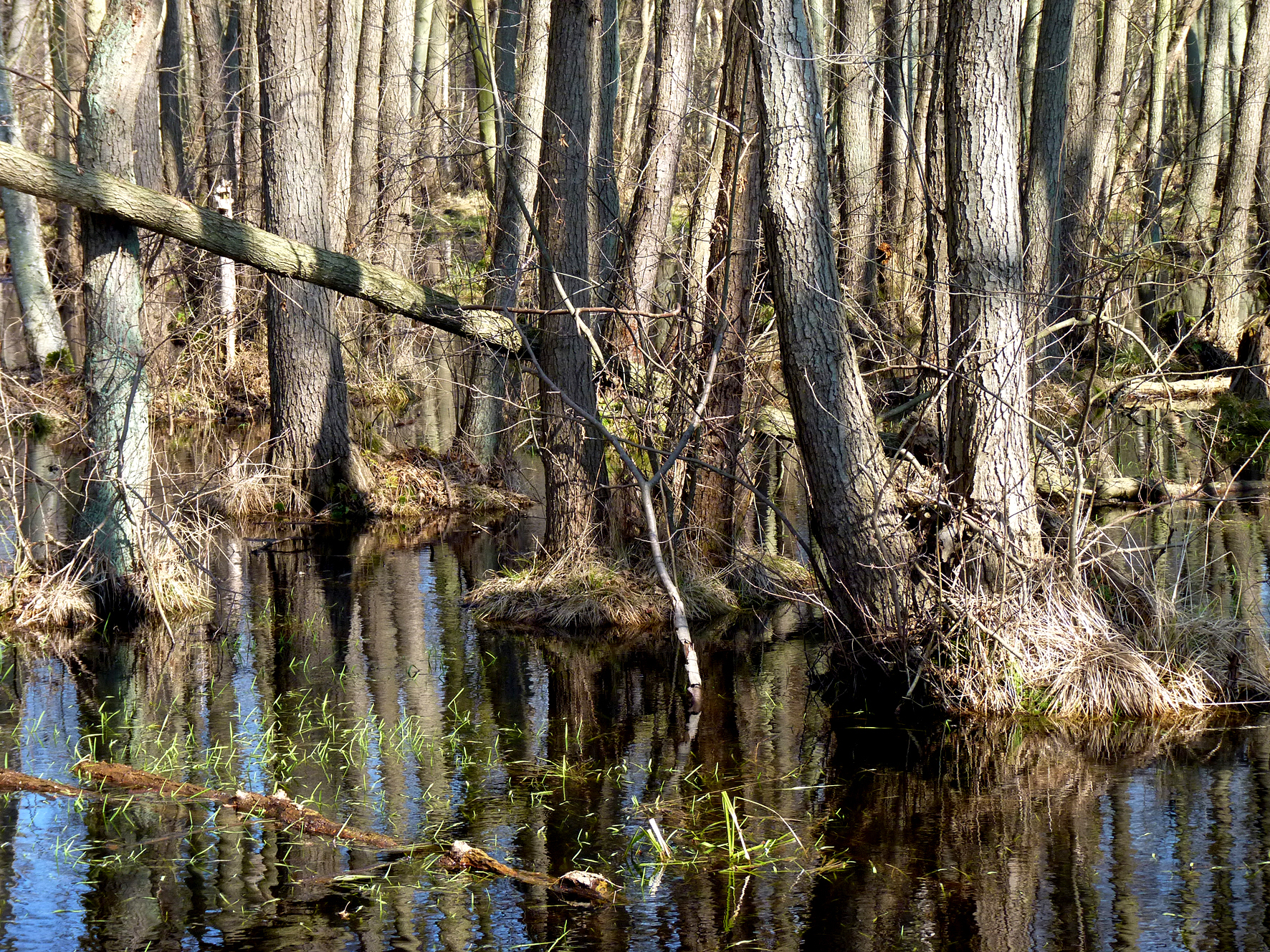 Zu den Impressionen aus dem Ribnitzer-Müritzer Großen Moor gehören braune Wasserlachen, im Moor stehende Buchen und große Schwinggrasflächen. Alles das ist bei einer geführten Moorwanderung zu erleben.