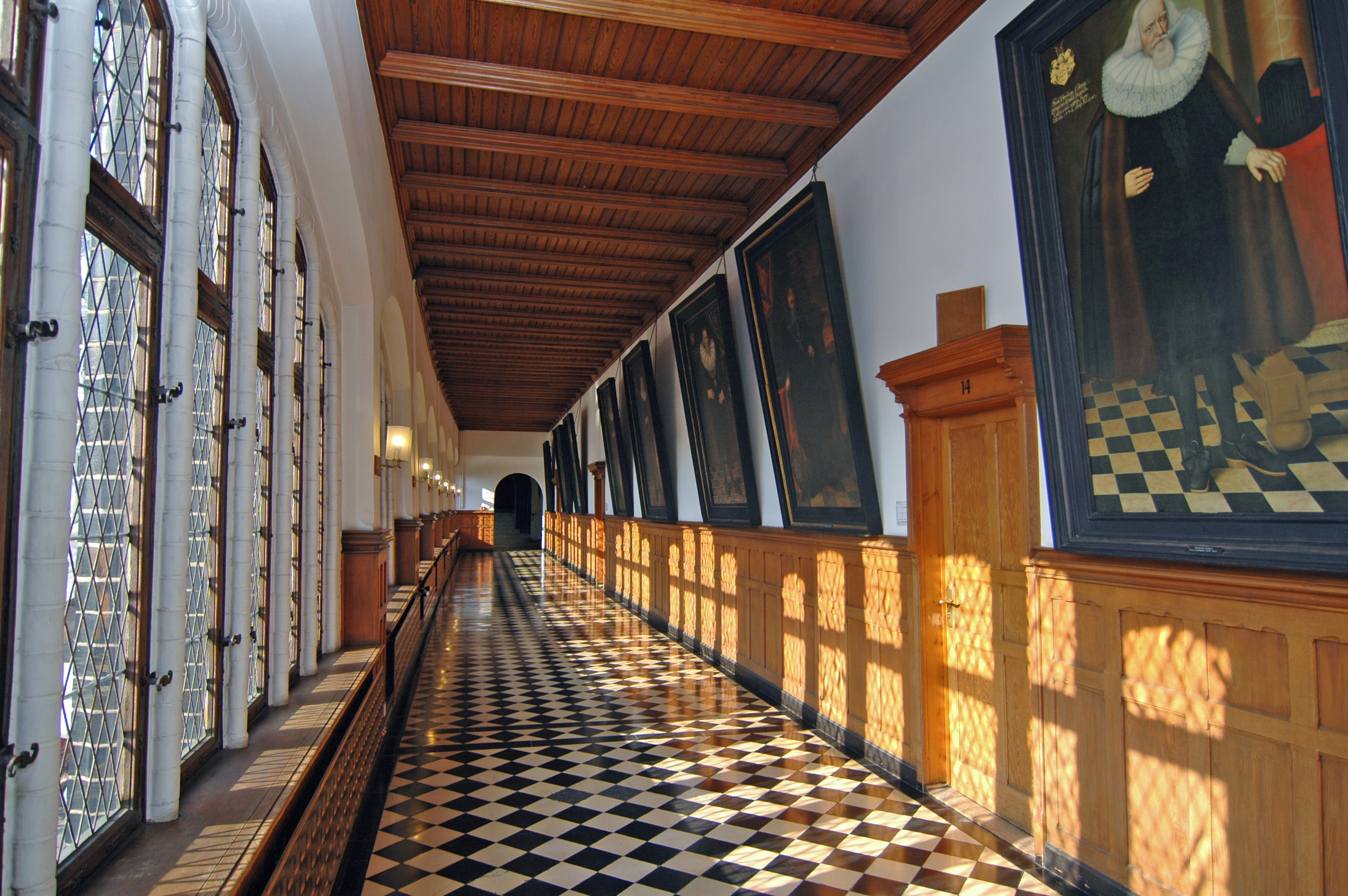 Flur des Rathauses Lübeck, den sogenannten Langen Jammer mit den Porträts Lübecker Bürgermeister zur Marktseite hin (aktuell sind 65 Bürgermeister als Gemälde zu sehen).