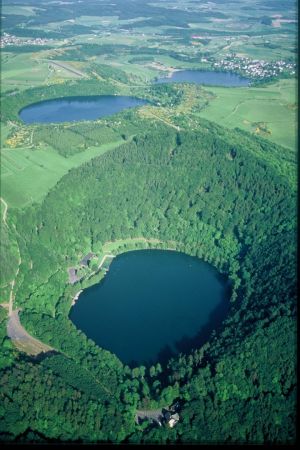 Beliebte Ausflugsziele in der Vulkaneifel sind die Kraterseen, die Maare. Abgebildet sind die drei Maare bei Daun. Wer Bewegung sucht, findet hier zahlreiche Wander- und Radwege, Nordic-Walking-Strecken sowie Freibäder.