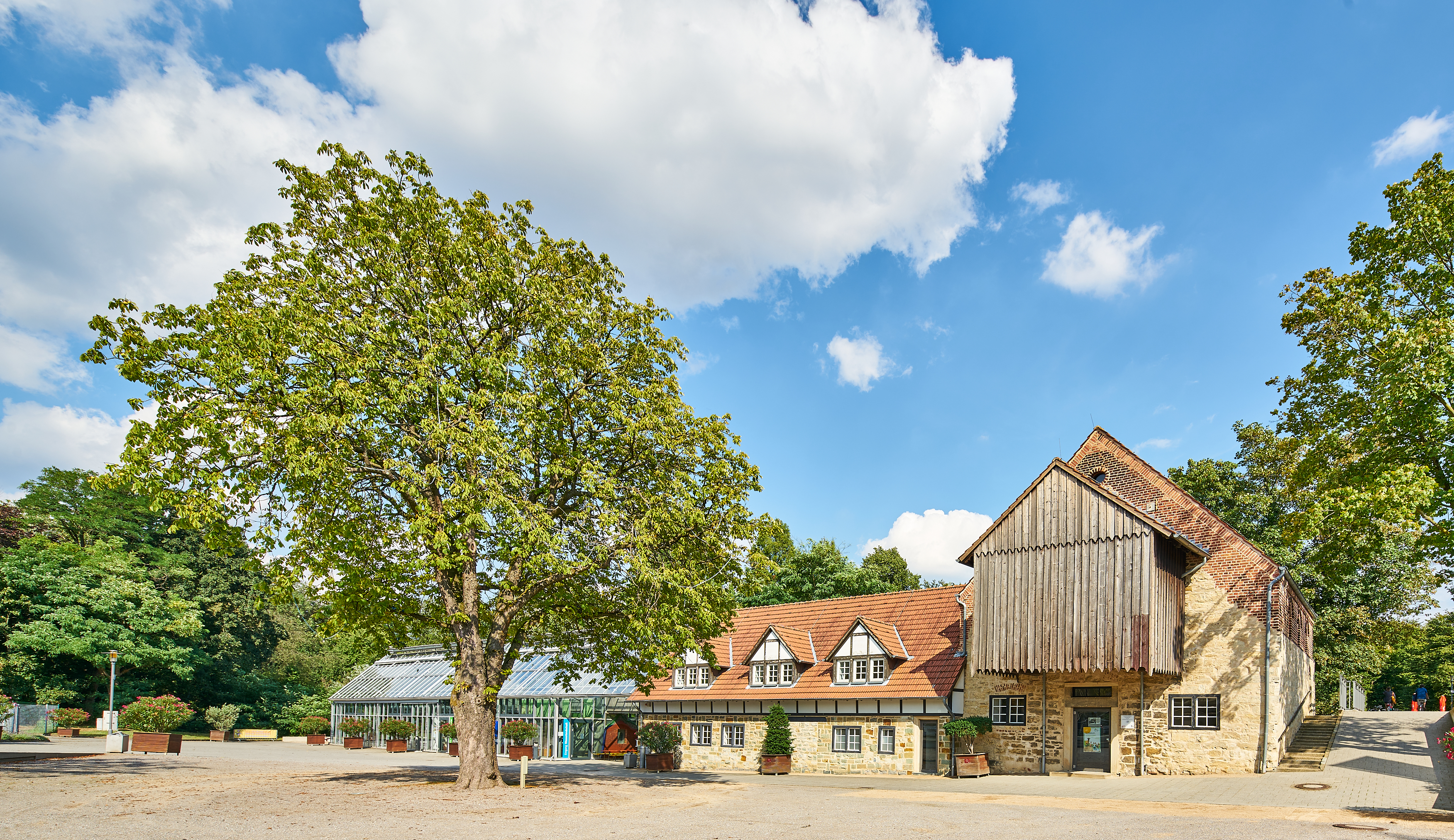 Ein sommerlicher Tag im Vier-Jahreszeiten-Park mit dem Gebäude des Kindermuseums Klipp Klapp in Oelde.
