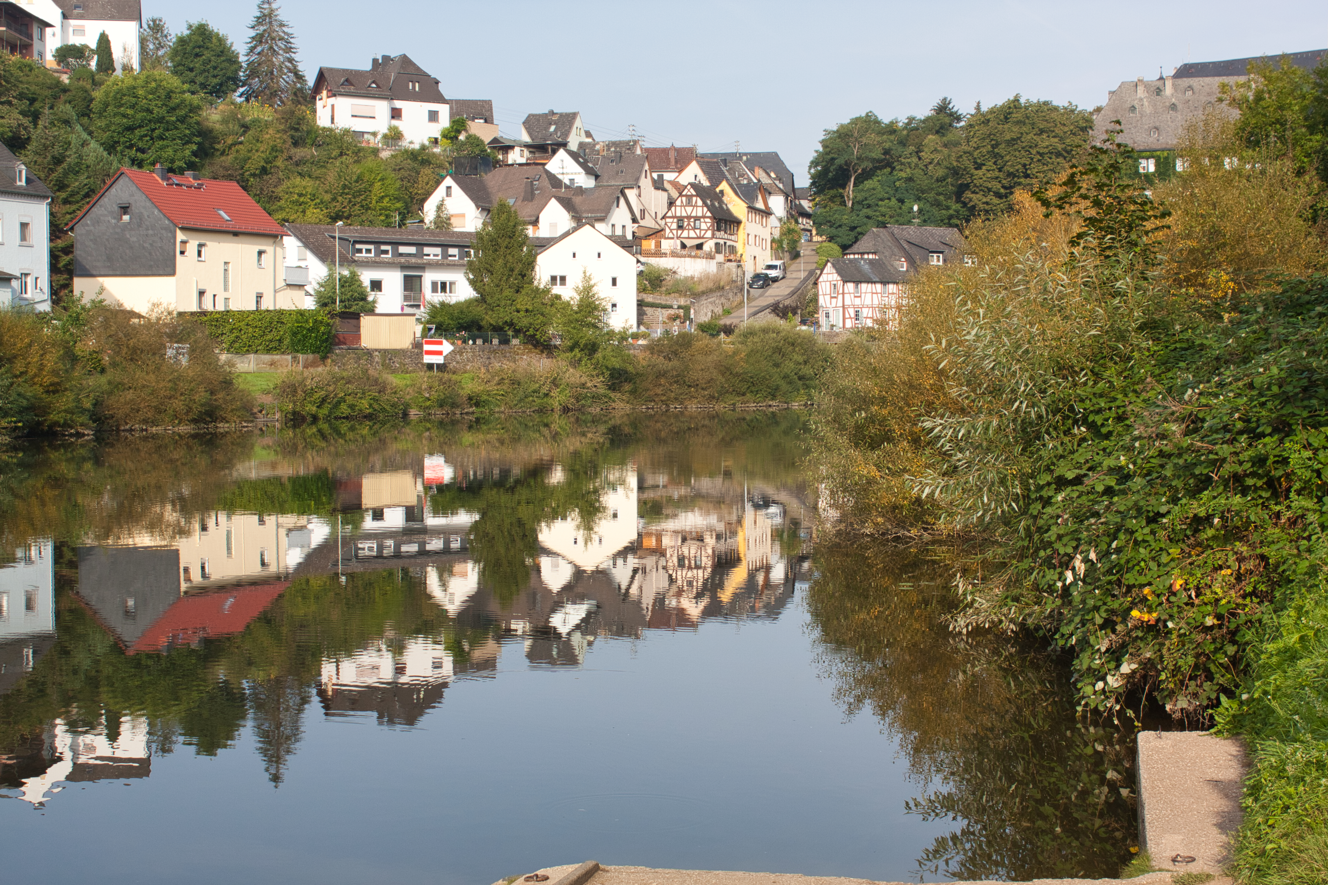 Blick auf die Altstadt von Runkel mit der Lahn im Vordergrund. >