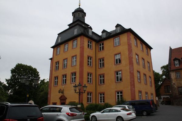 Das Barockschloss in Gedern mit Schloßmauern, Mittelbau mit Turm und im Bild vorne mit der Schloßberg - Straße (Allee).