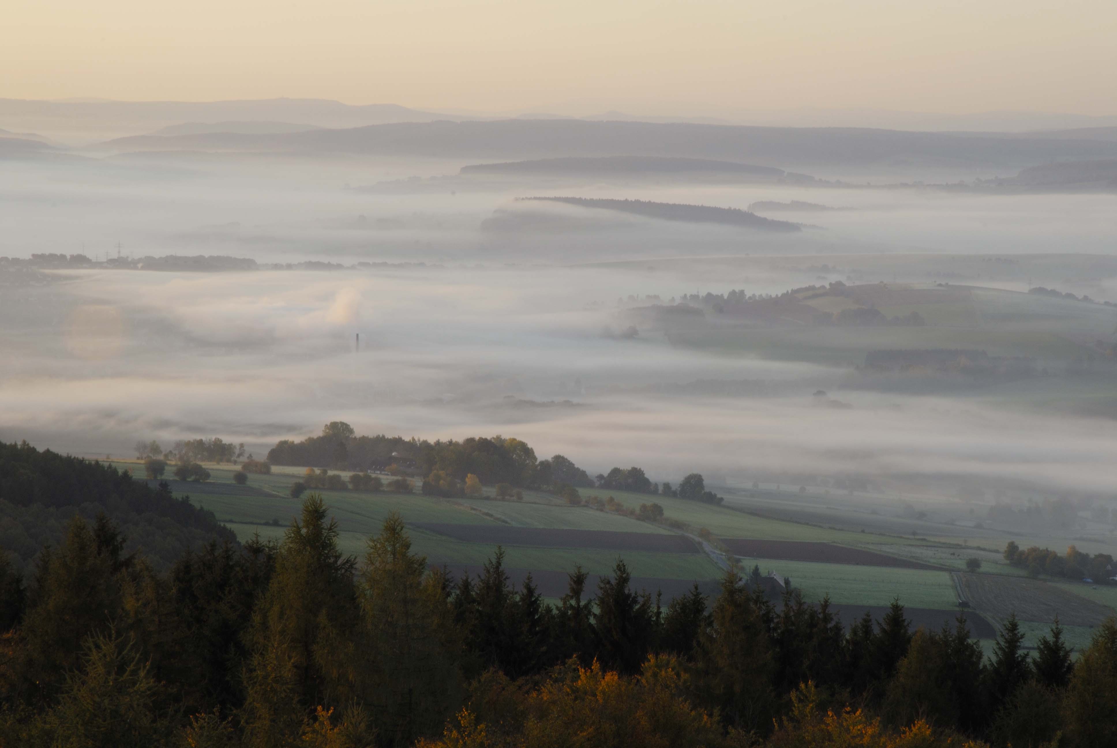 Landschaft Uslarer Land im morgendlichen Nebel. >