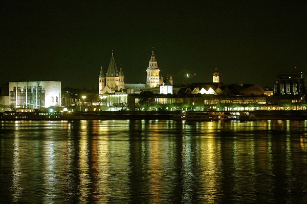 Auf dem Bild sieht man die Mainzer Stadtsilhouette bei Nacht. Dabei liegt auf dem Foto links das Mainzer Rathaus und mittig der Mainzer Dom.