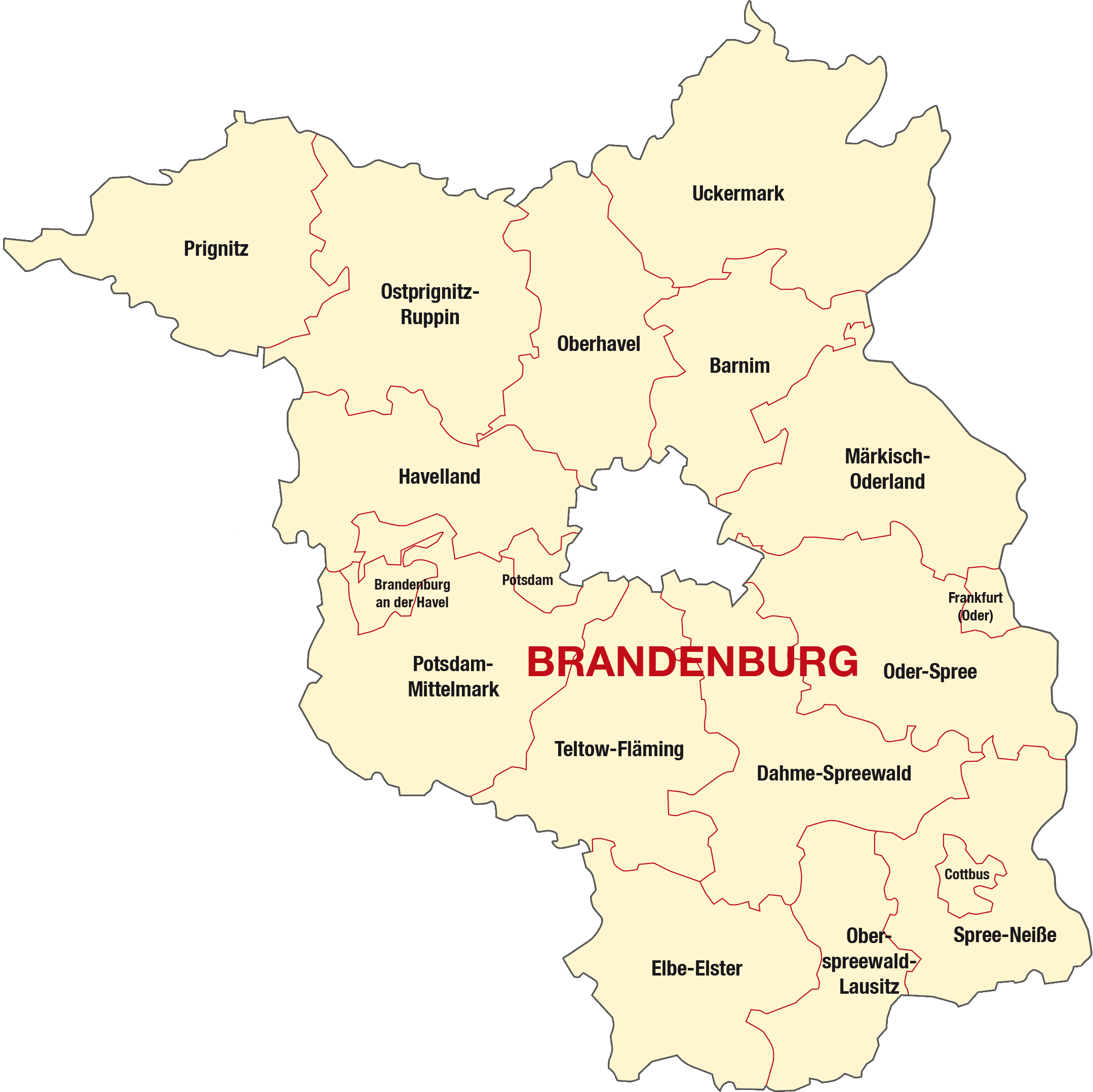 BarnimBrandenburgCottbusDahme-SpreewaldElbe-ElsterFrankfurt OderHavellandMärkisch-OderlandOberhavelOberspreewald-LausitzOder-SpreeOstprignitz-RuppinPotsdamPotsdam-MittelmarkPrignitzSpree-NeißeTeltow-FlämingUckermark