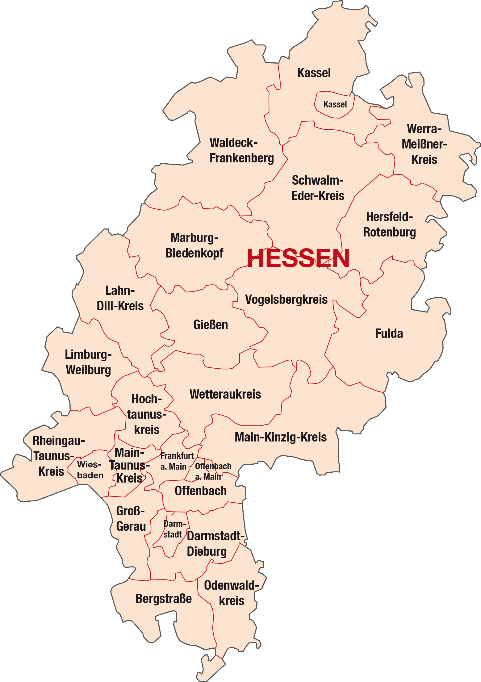 BergstraßeDarmstadtDarmstadt-DieburgFrankfurt am MainFuldaGießenGroß-GerauHersfeld-RotenburgHochtaunuskreisKasselLahn-Dill-KreisLimburg-WeilburgMain-Kinzig-KreisMain-Taunus-KreisMarburg-BiedenkopfOdenwaldkreisOffenbachRheingau-Taunus-KreisSchwalm-Eder-KreisVogelsbergkreisWaldeck-FrankenbergWerra-Meißner-KreisWetteraukreisWiesbaden