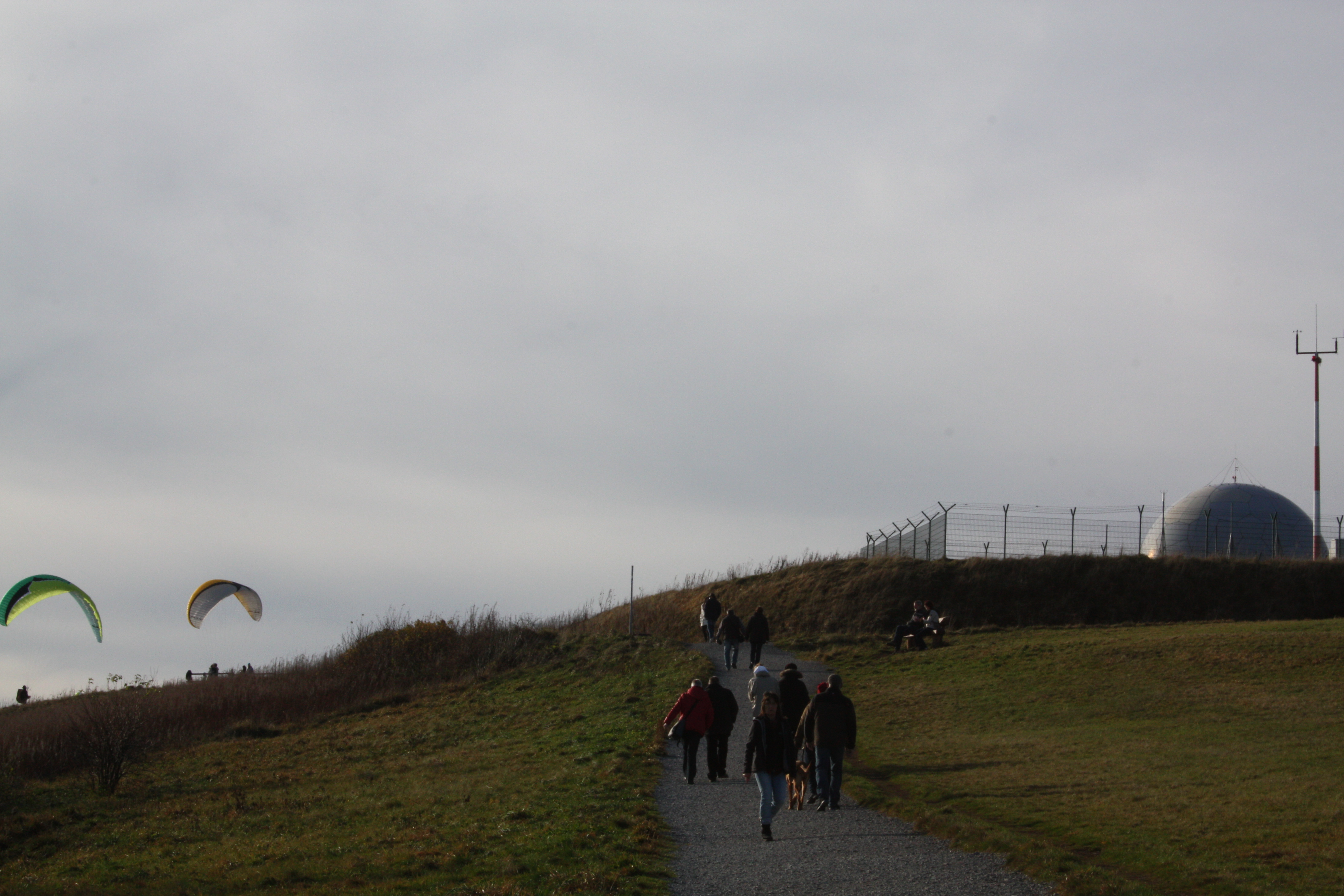 Paraglider und der Radom mit dem Ausblick von der Wasserkuppe in das Biosphärenreservat Rhön.