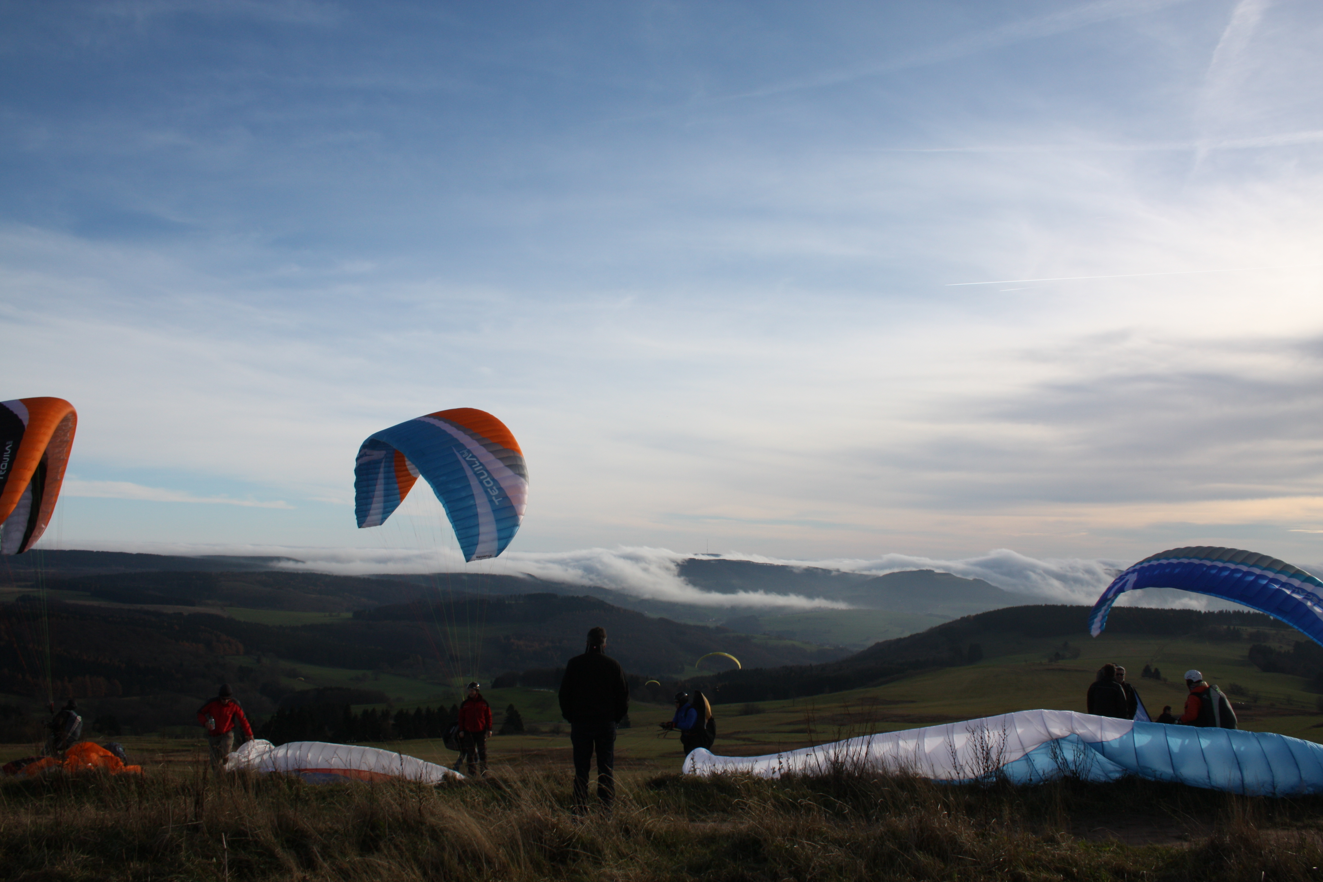 Paraglider mit dem Ausblick von der Wasserkuppe in das Biosphärenreservat Rhön.