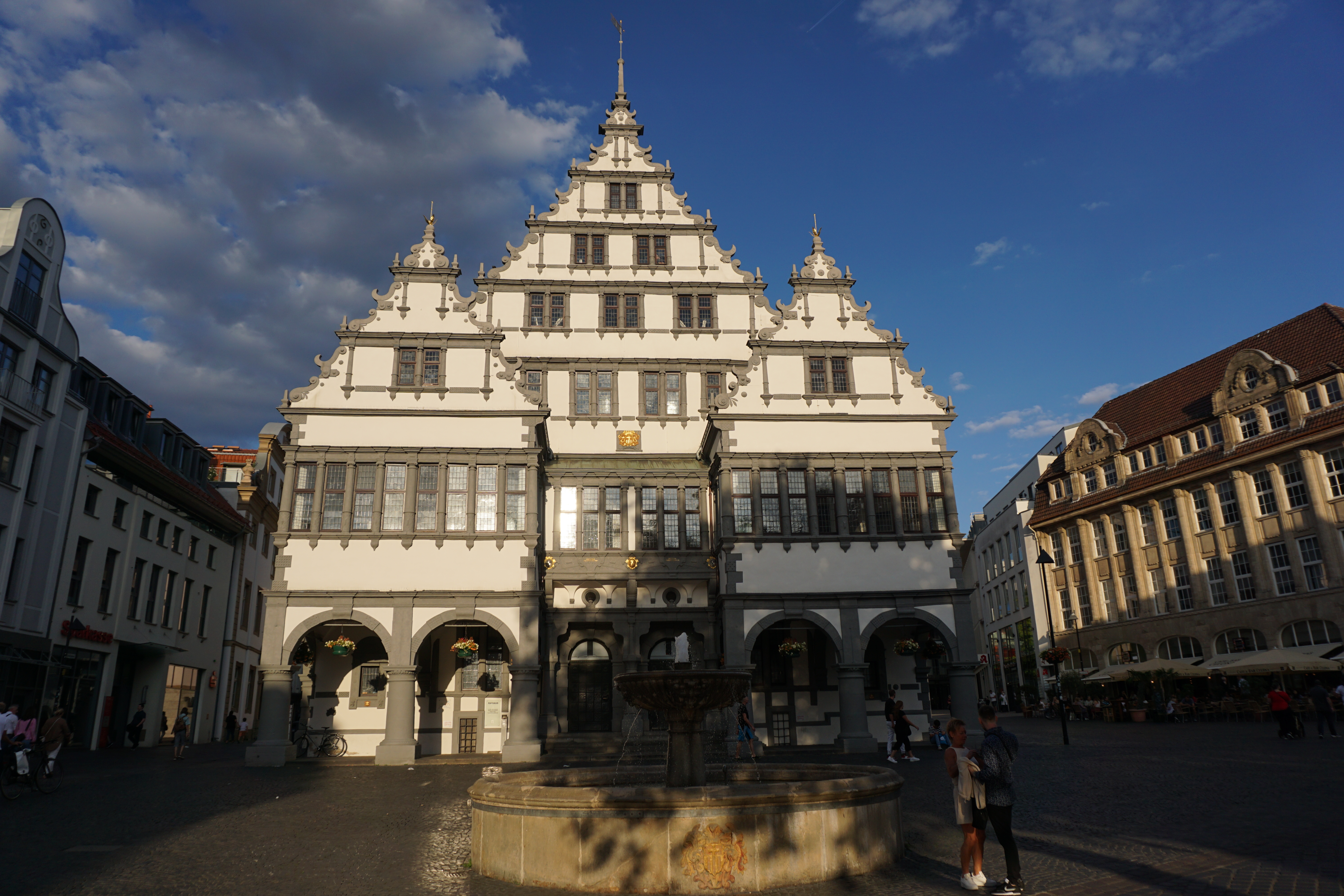 Das Paderborner Rathaus mit Marktbrunnen bei Sonnenuntergang.