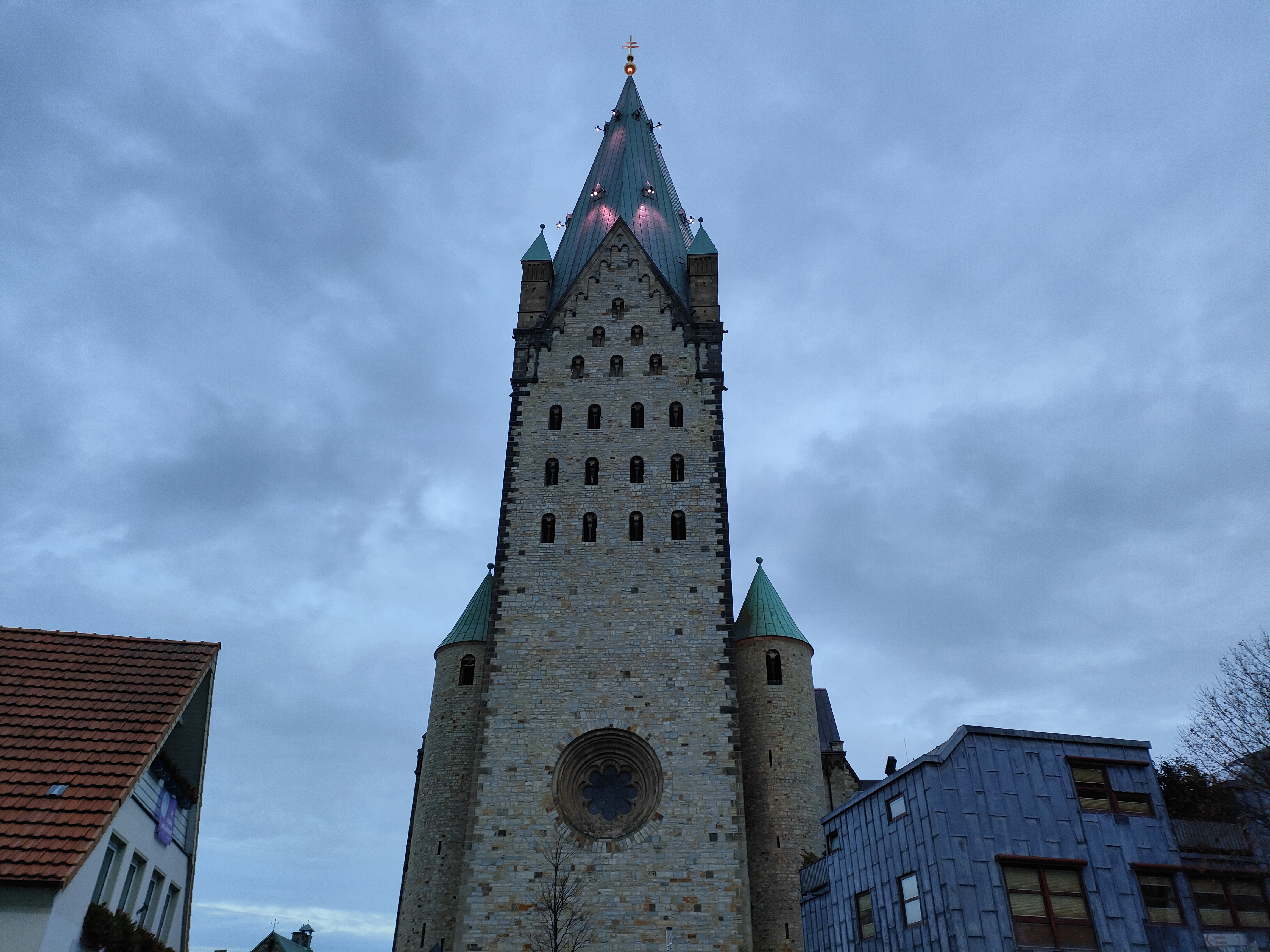 Turm vom Paderborner Dom bei Dämmerung.