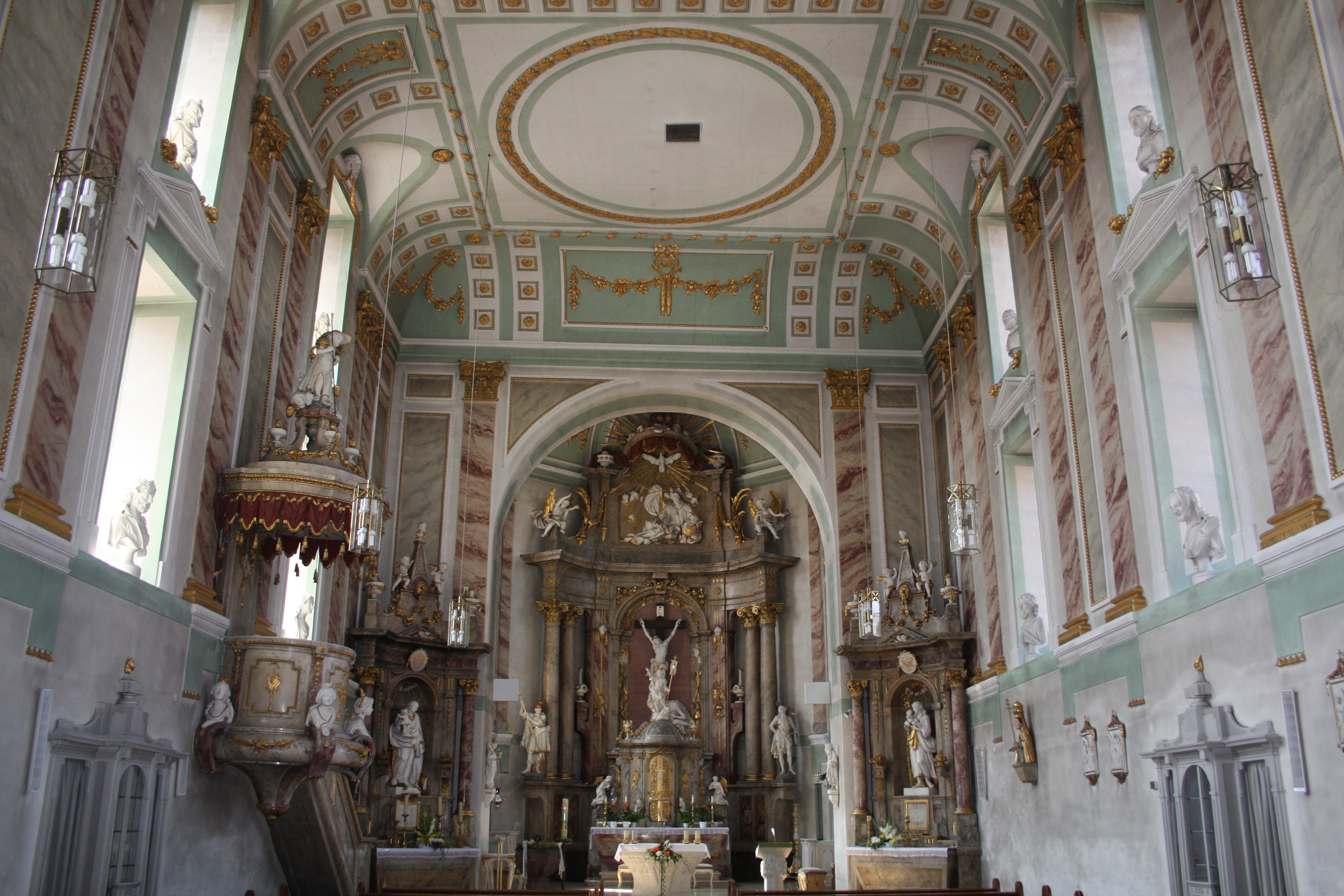 Im Inneren befindet sich klassizistische Dekoration mit Stuck an Altären und Kanzel vom Würzburger Hofstuckateur Materno Bossi aus dem Jahre 1790.