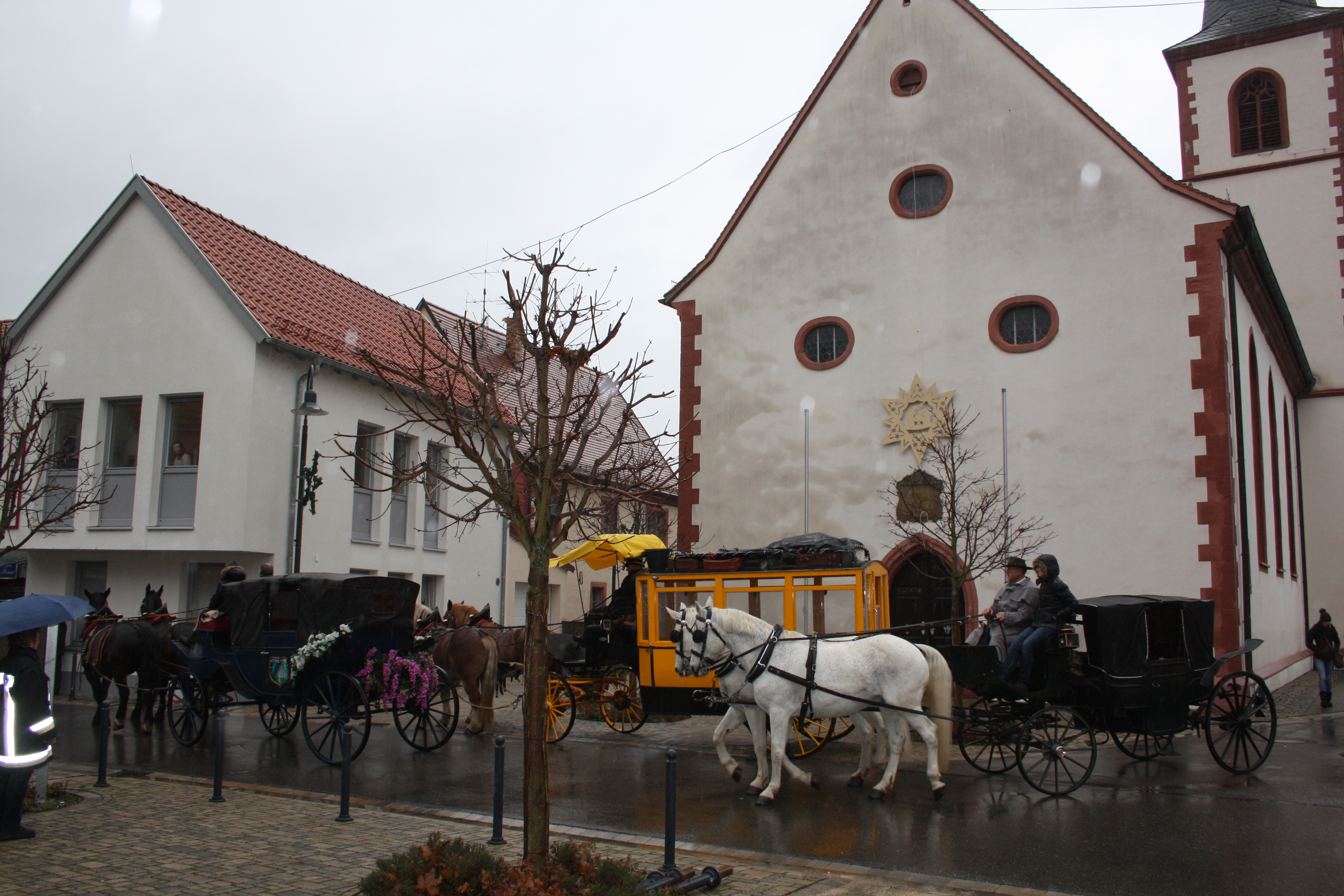 Weihnachtsmarkt Himmelstadt: Die Kutschen fahren vor zum Weihnachtspostamt, vorbei an der Kirche.