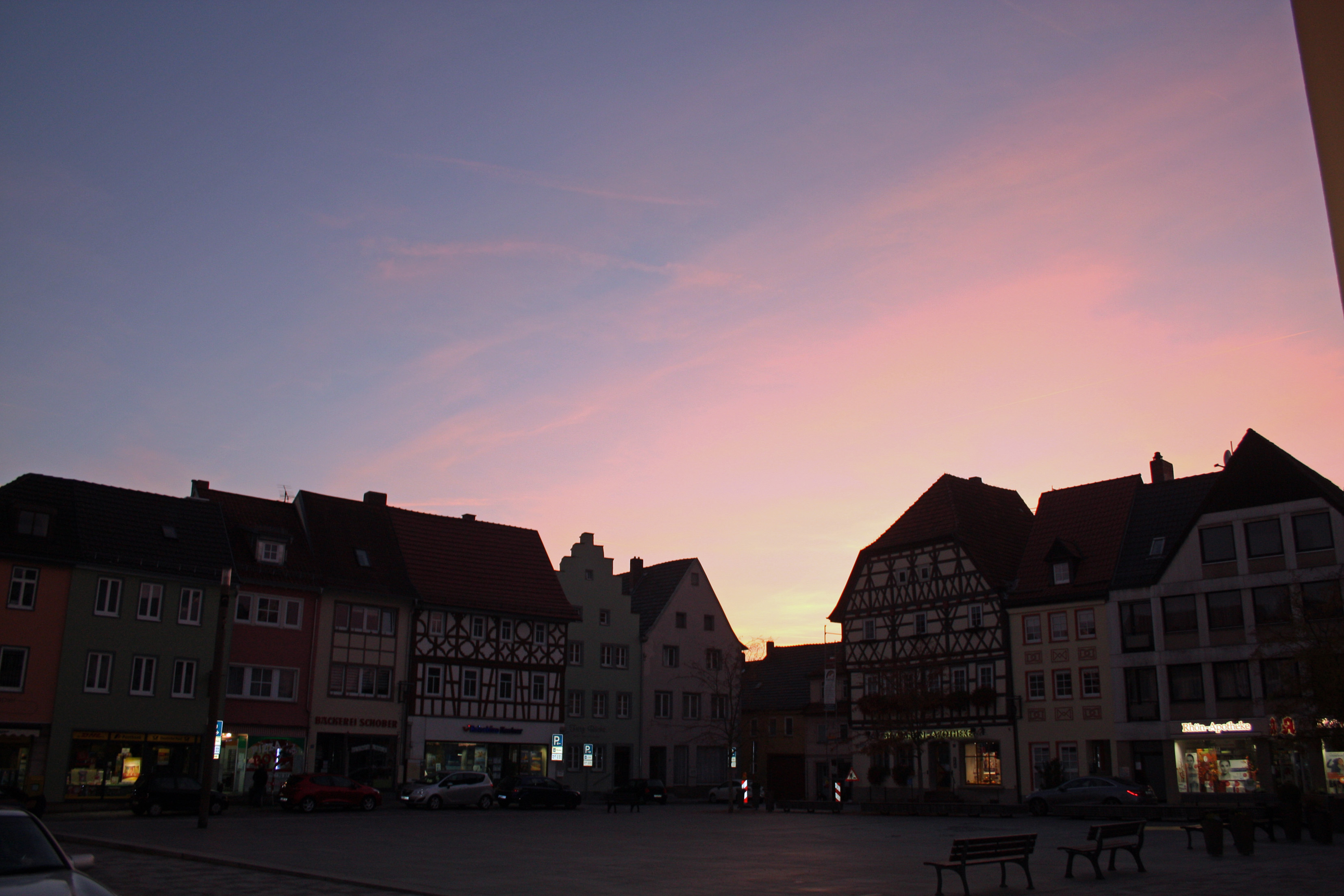 Marktplatz Mellrichstadt bei Abend.