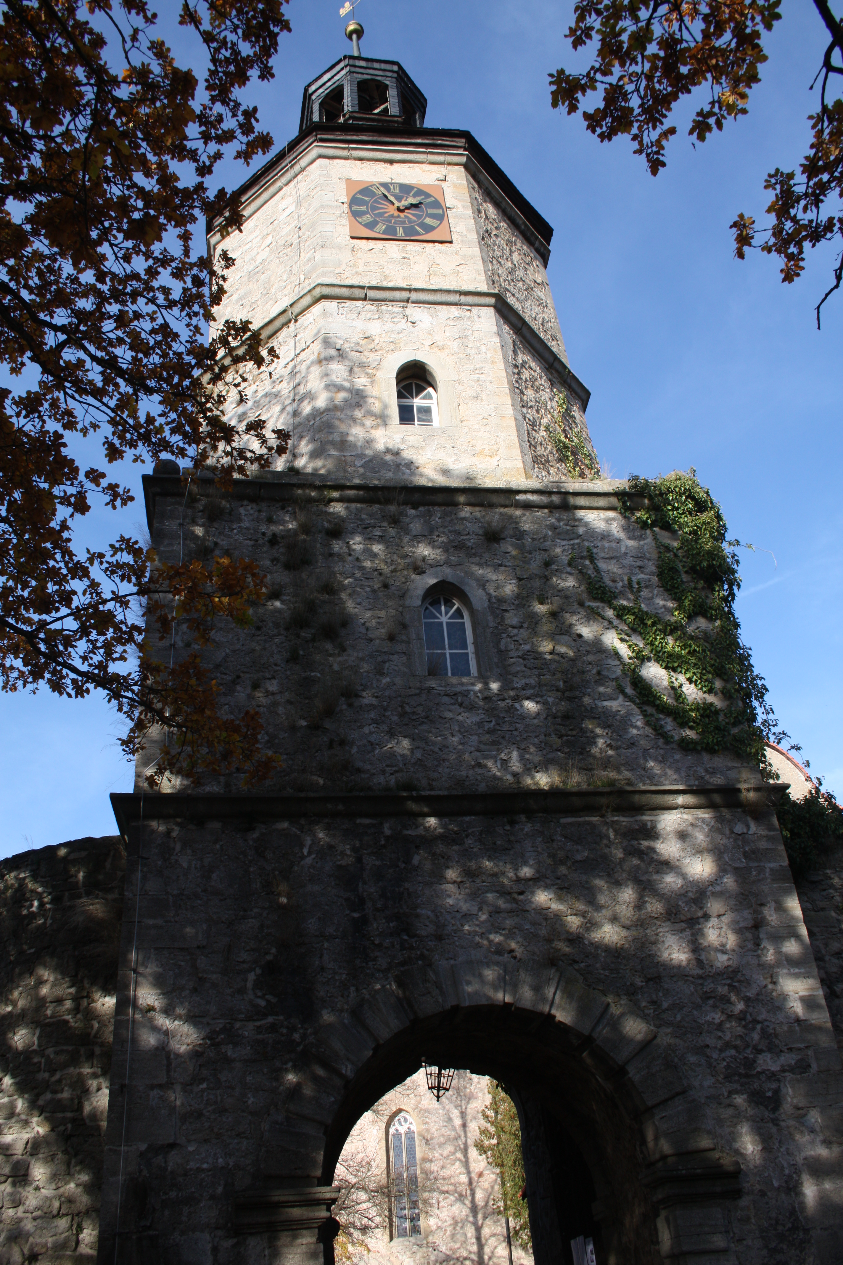Der achteckige Turm mit Zwiebelhaube, hier auf dem Bild, wurde 1629 auf das Torhaus der spätmittelalterlichen Wehrmauer gesetzt.