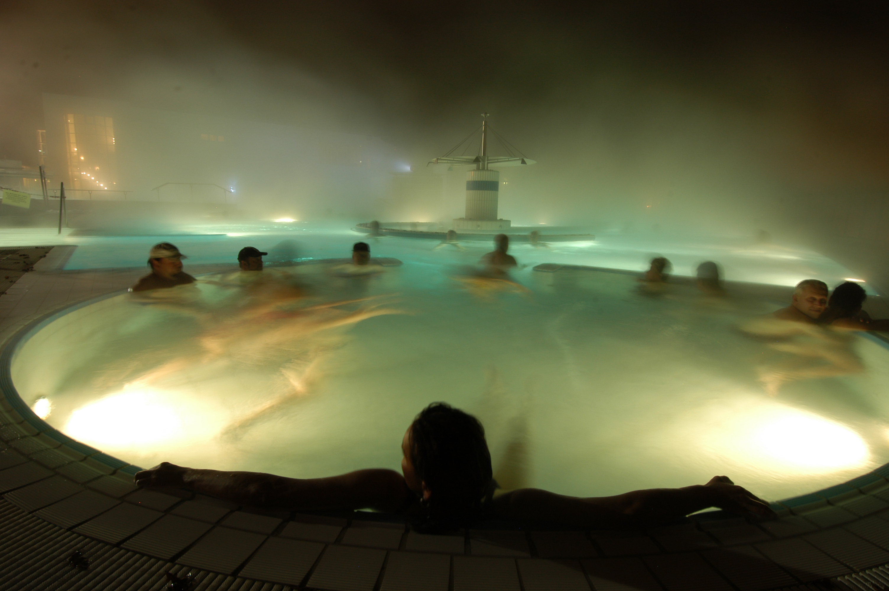 Außenbecken der Europa Therme bei Nacht.
