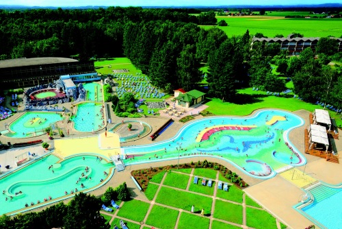 Mit mehr als 12.000 qm Wasserfläche, hier die Außenbecken des Johannesbads, bietet Bad Füssing seinen Gästen Europas weitläufigste Thermenlandschaft.