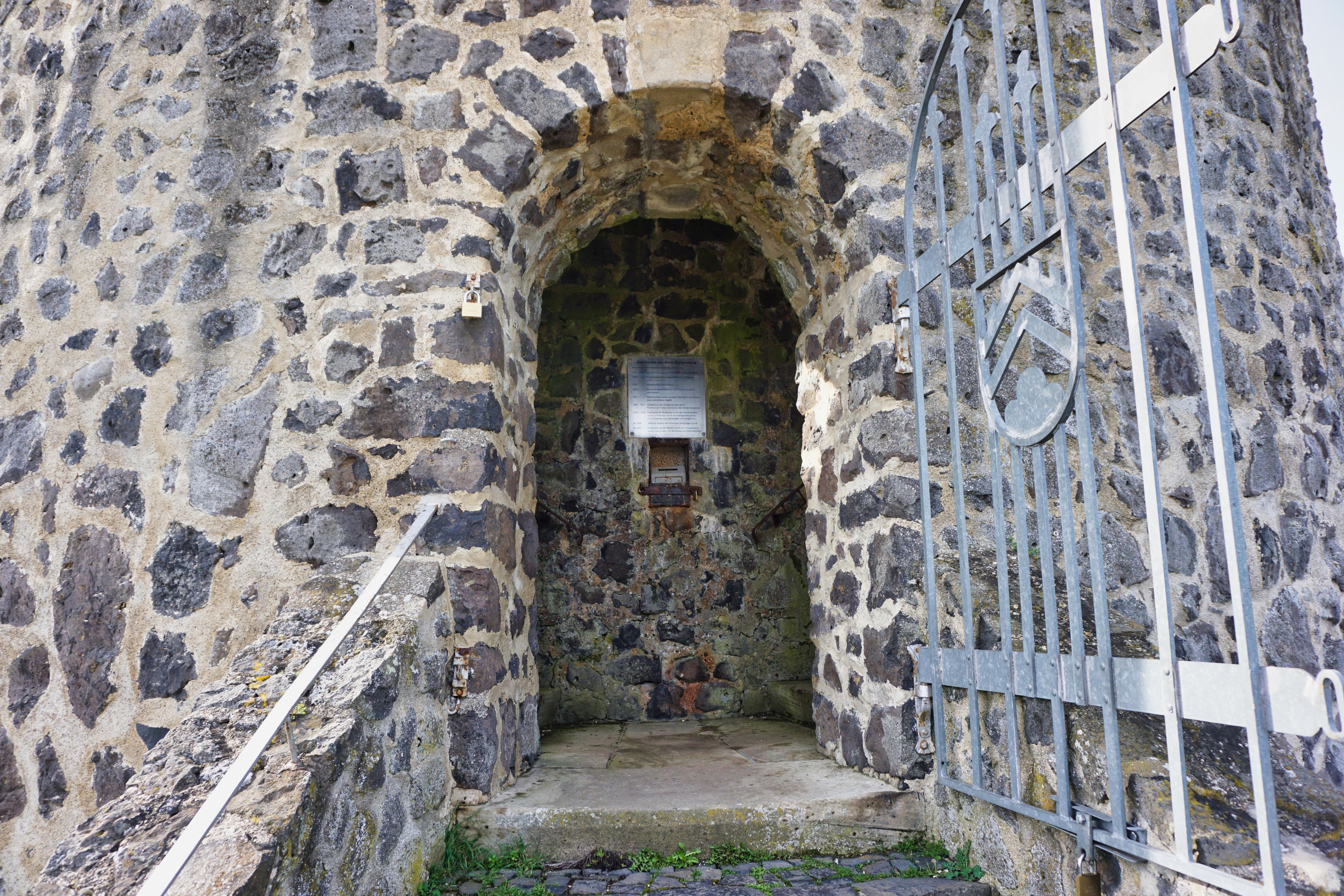 Eingang zum Bergfried (Burgturm) der Burgruine Heiligenberg, Felsberg.