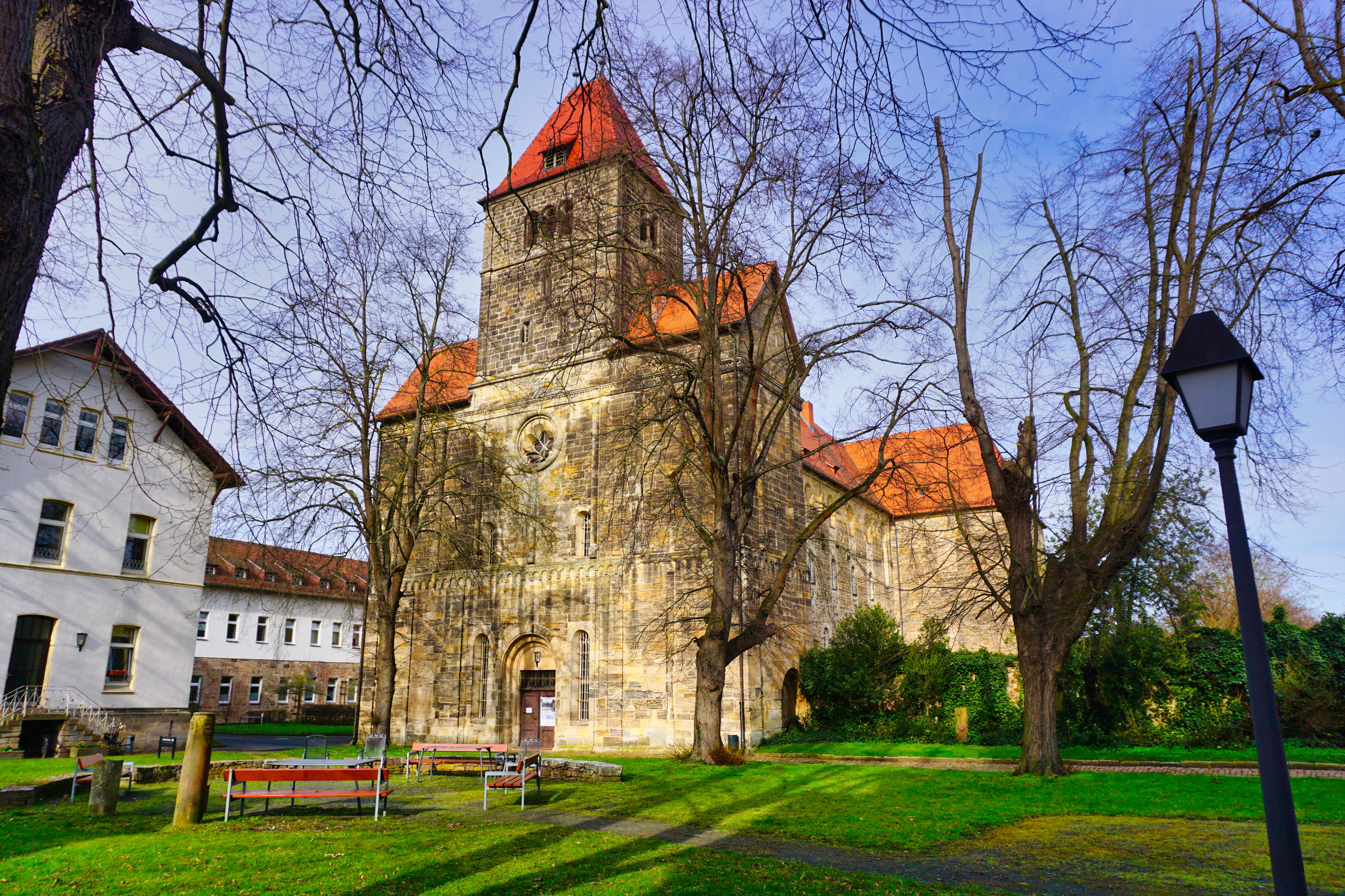 Hier der mächtige Turm der ehemaligen Klosteranlage von der Zehntscheune aus aufgenommen.