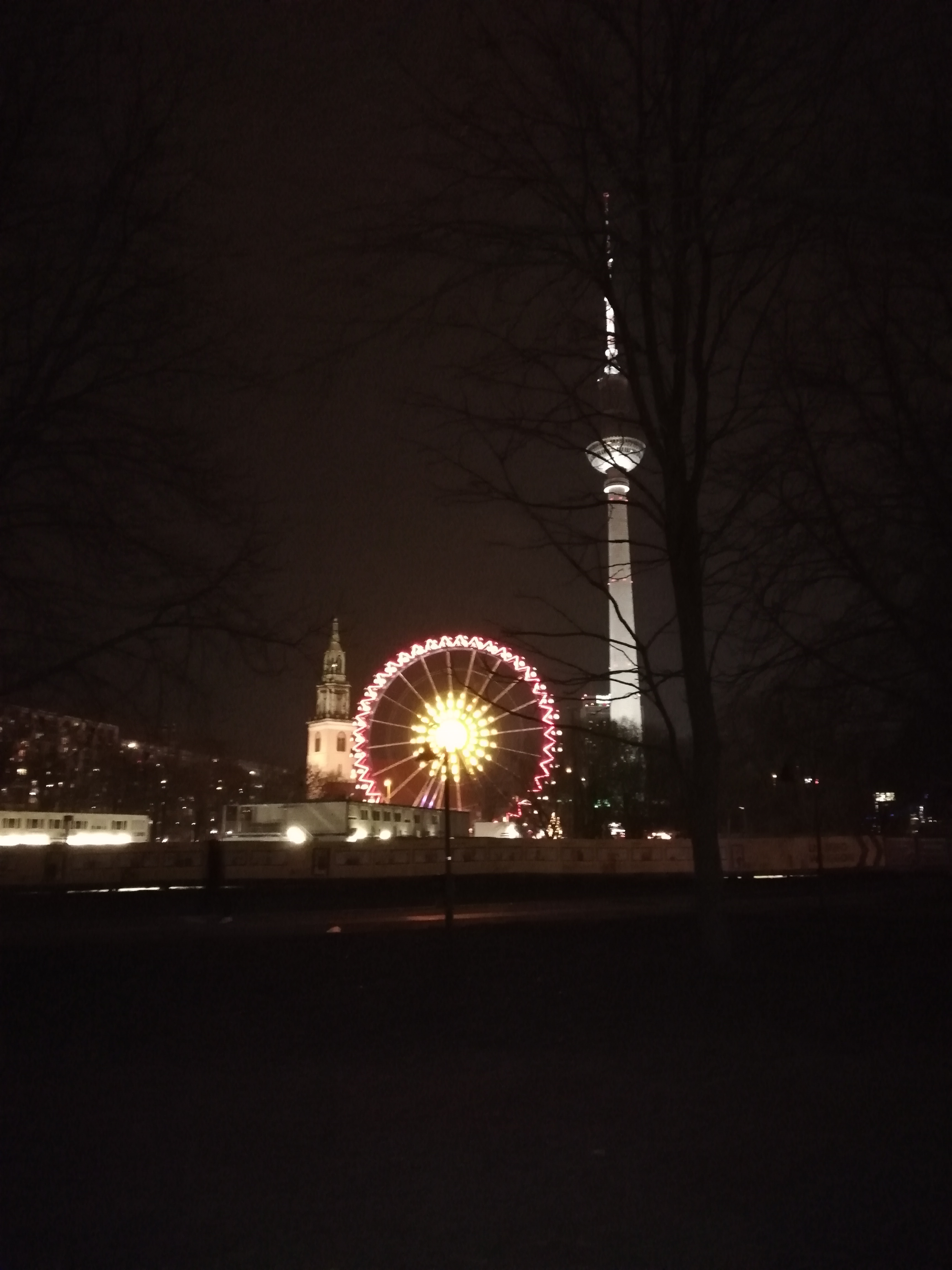 Berliner Fernsehturm mit Riesenrad bei Nacht.