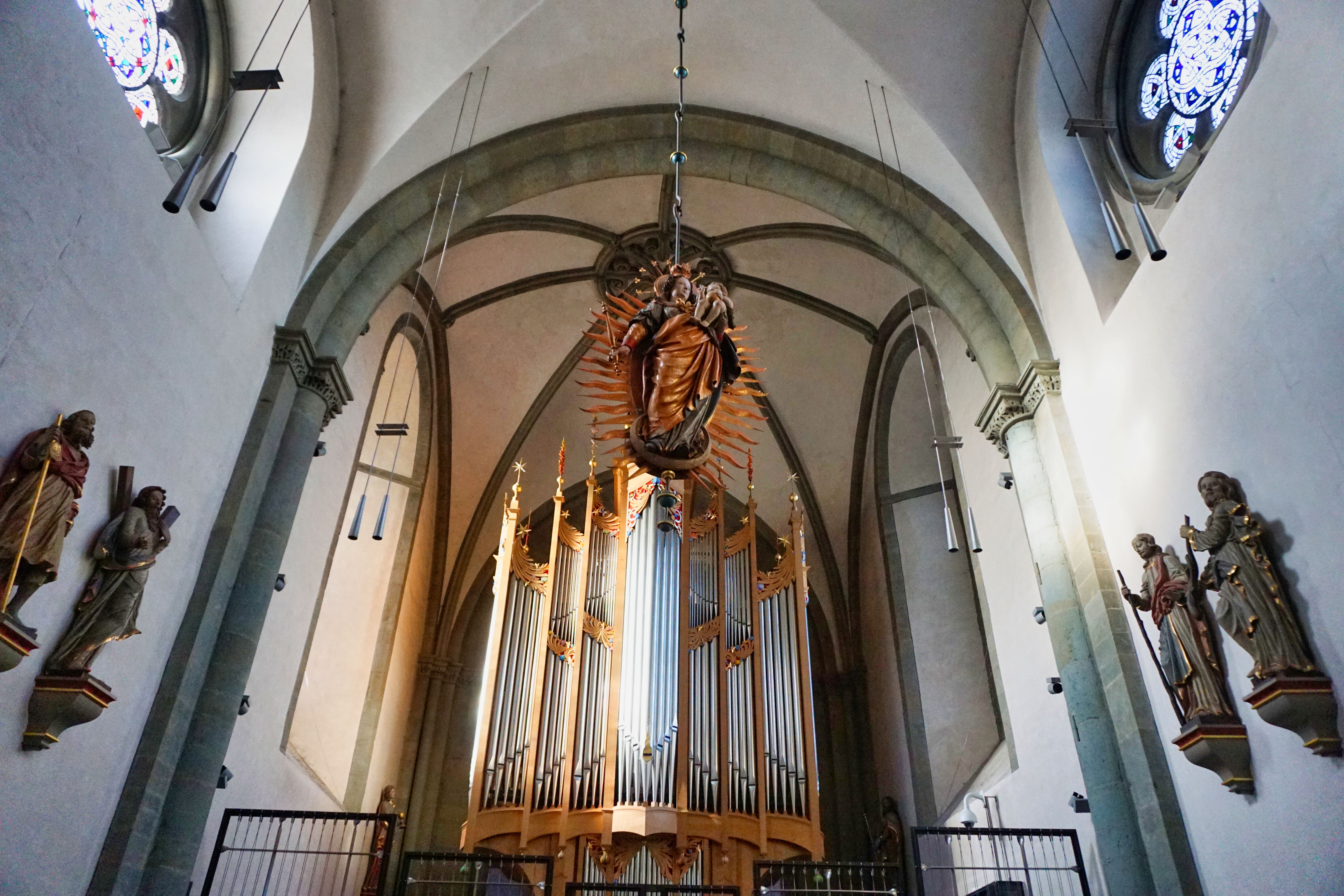 Die Madonna mit dem Strahlenkranz hängt vom Gewölbe des Mittelschiffes in der Kirche St. Laurentius Erwitte herab.