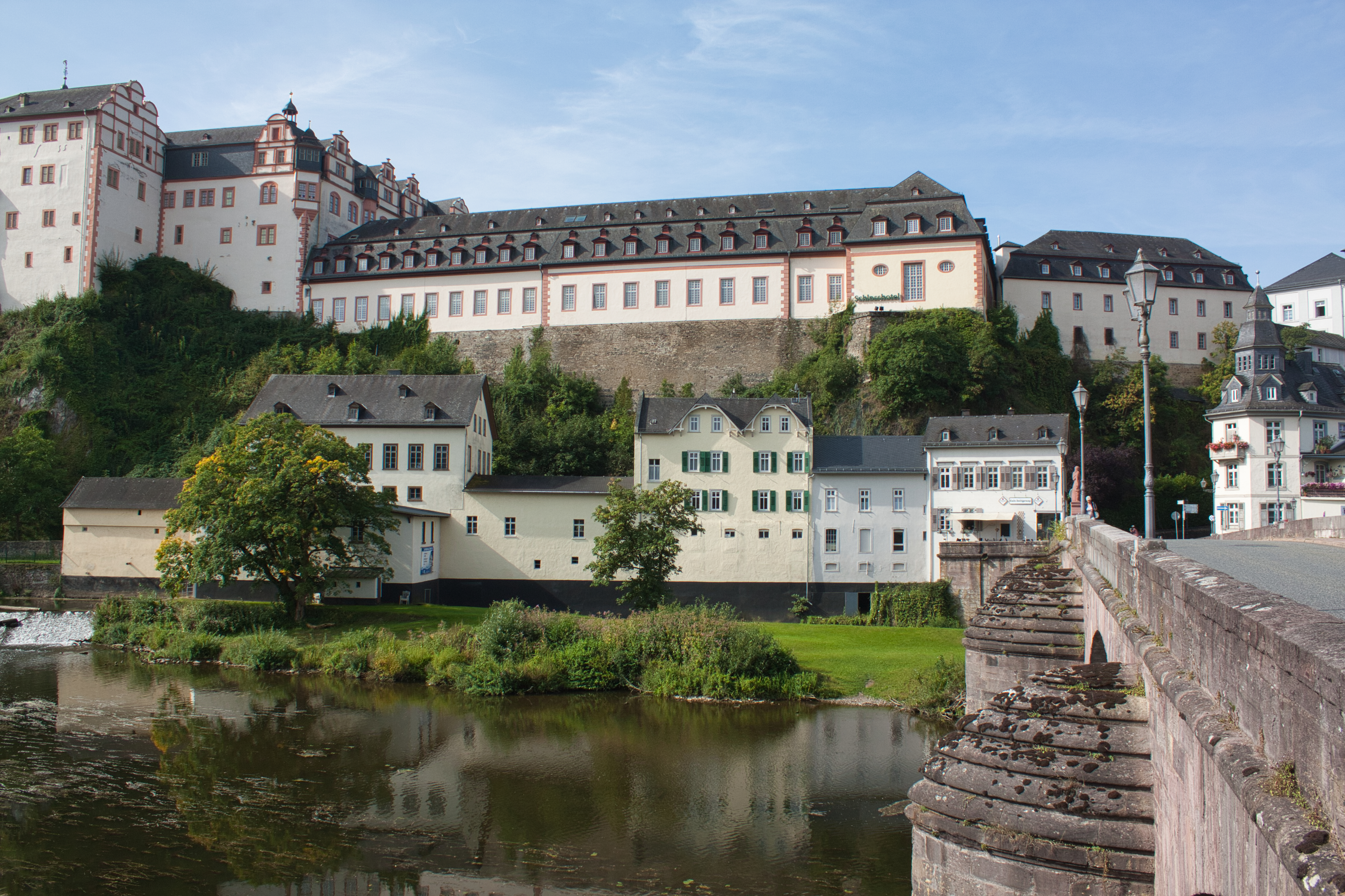 Weilburger Schloss mit Altstadt, steinerner Brücke und Lahn.