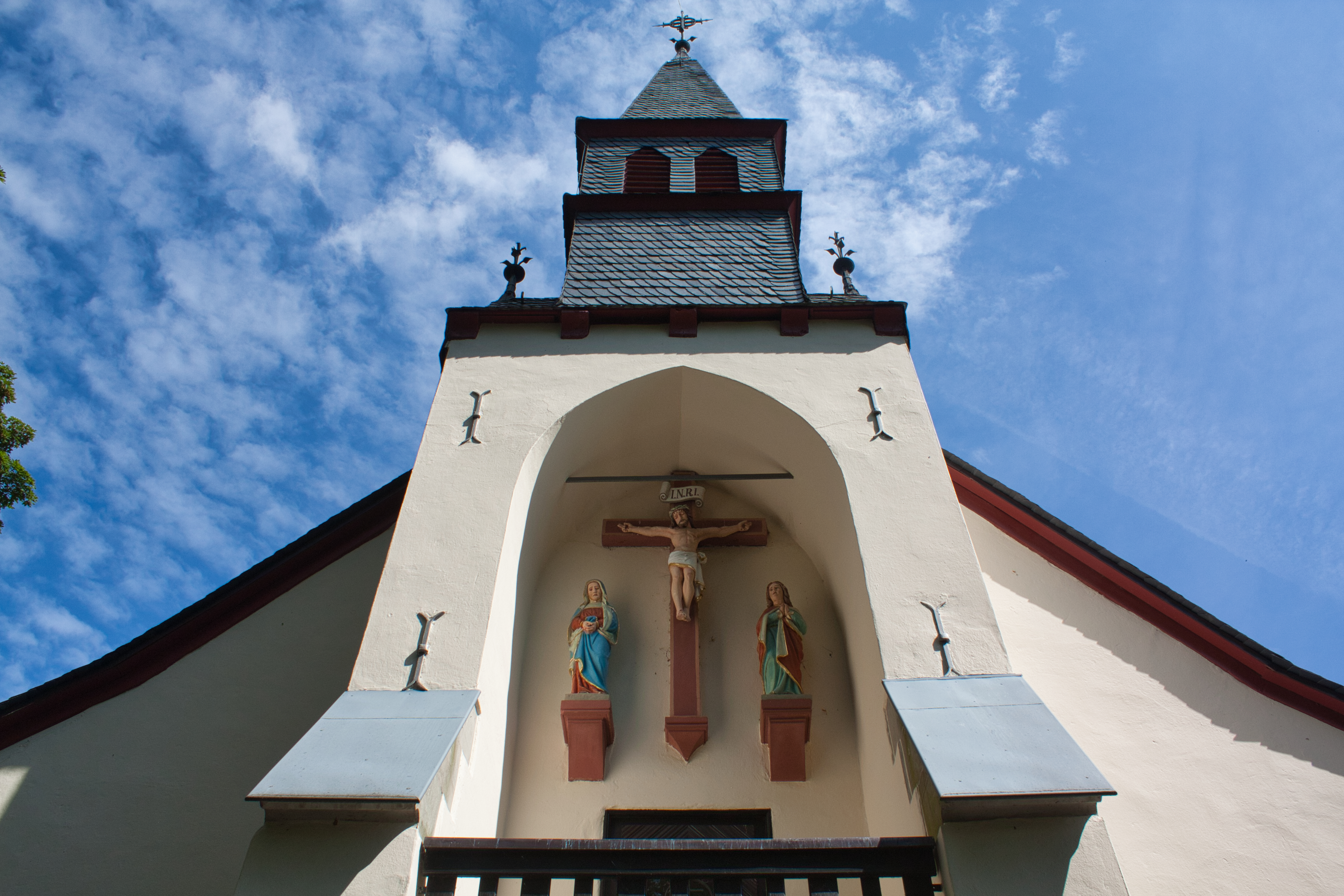 Die Außenkanzel der Marienkapelle mit Kreuz sowie Statuen von der heiligen Maria und Apostel Johannes.