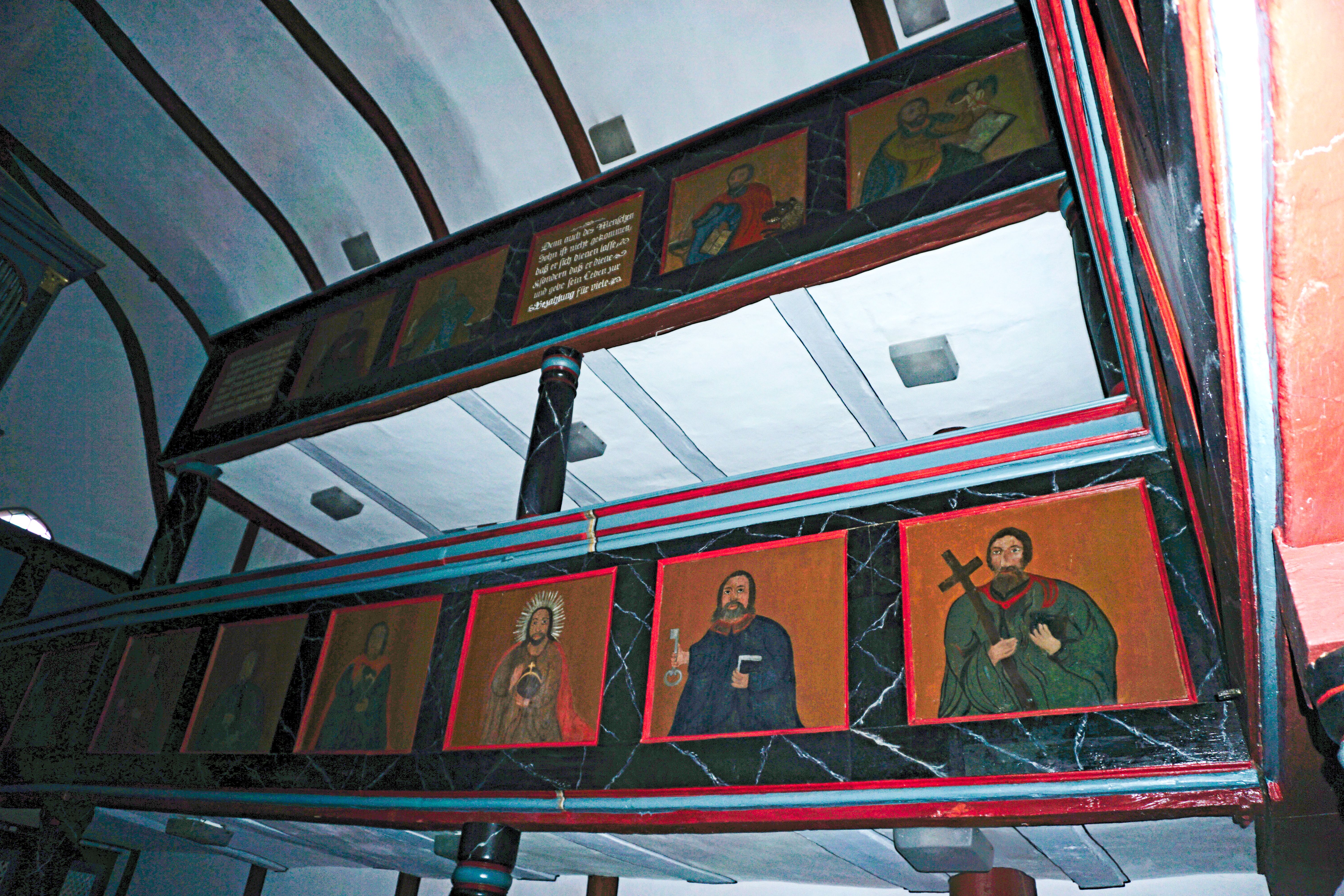 Empore mit Brüstungsmalereien in der evangelischen Fachwerkkirche Stumpertenrod, Feldatal.