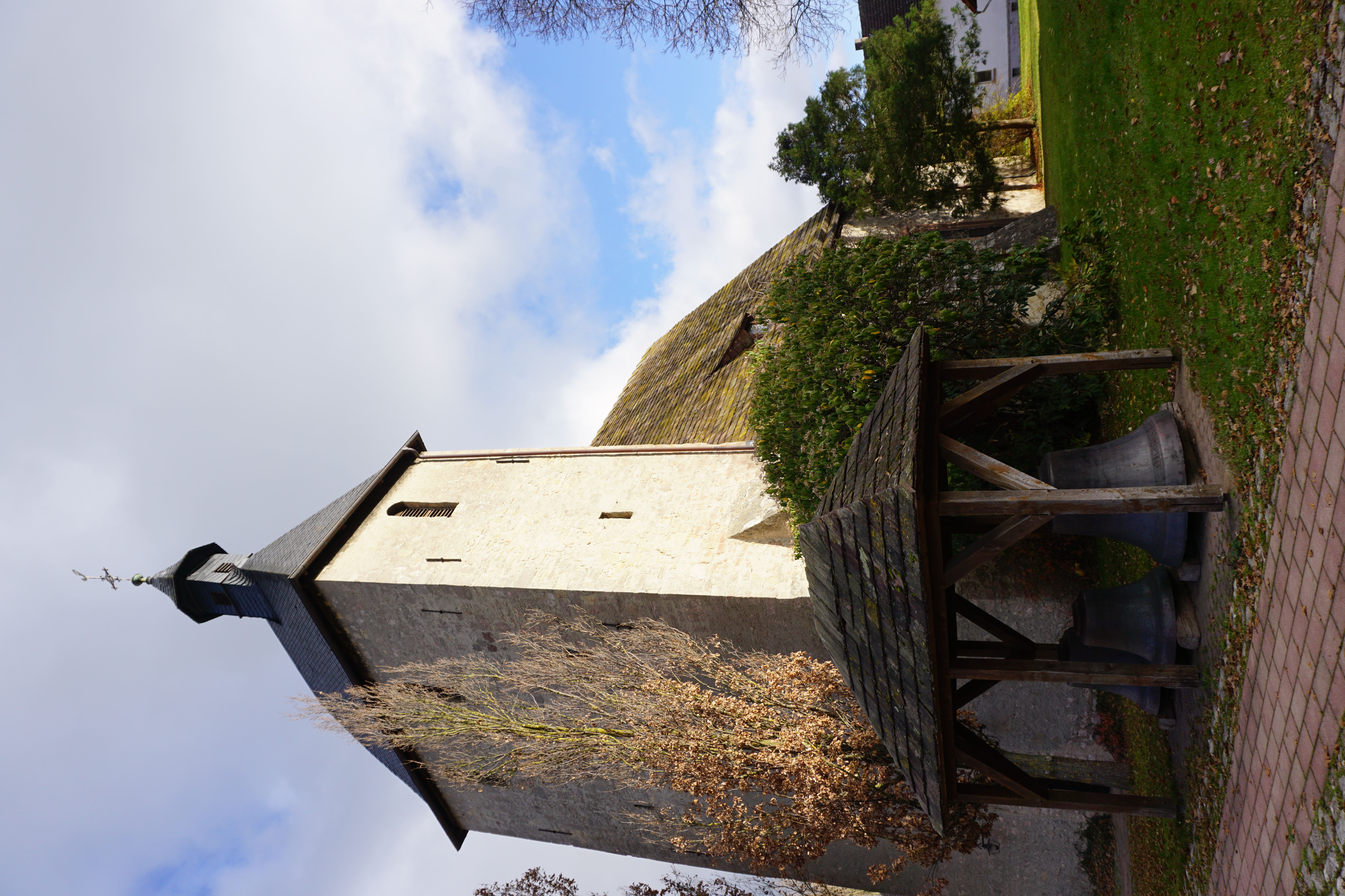 Kirchturm mit den historischen Glocken vor der Pfarrkirche.