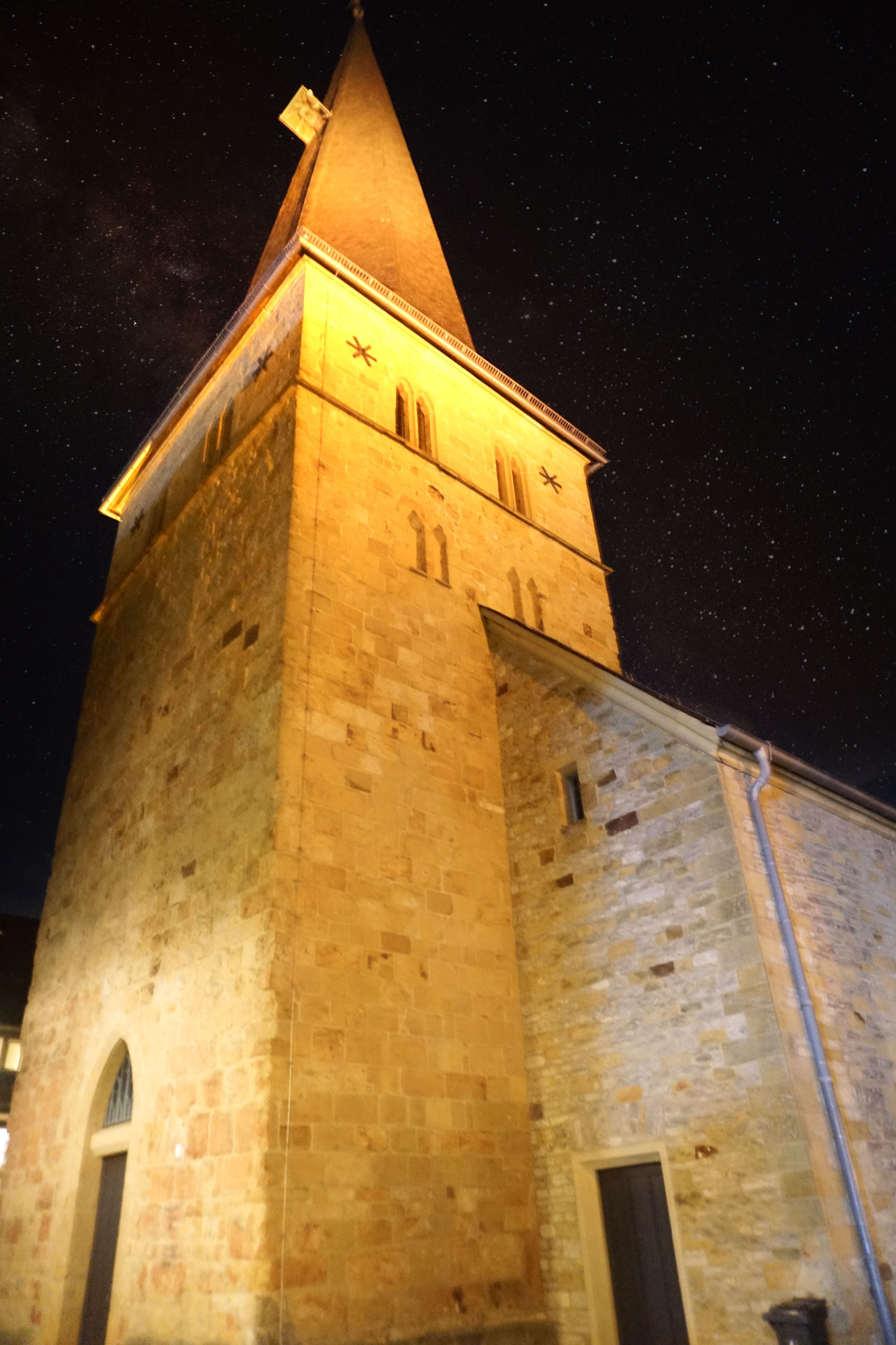 Turm Apostelkirche Gütersloh bei Nacht.