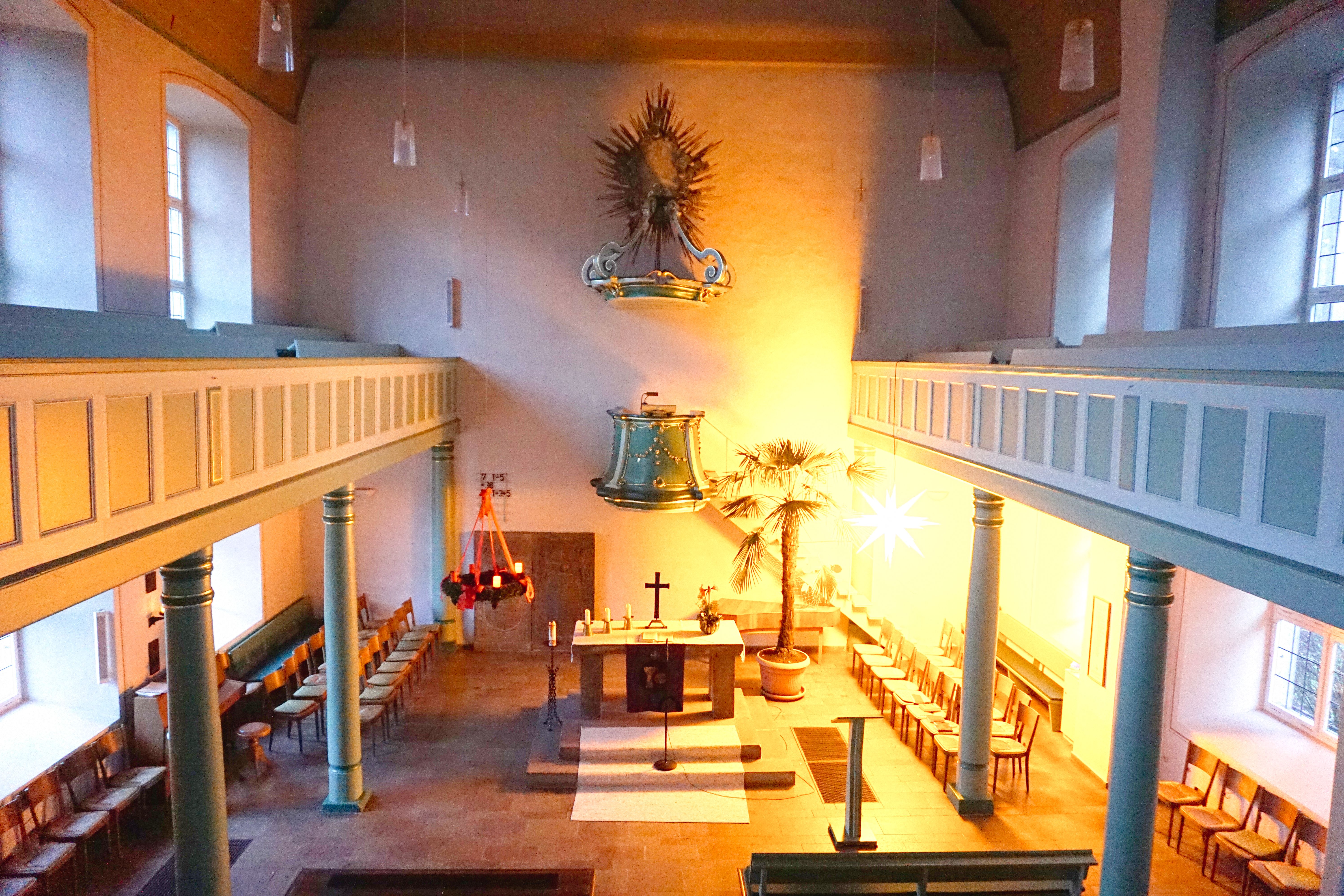 Innenraum mit Kanzel in der evangelischen Kirche Niederaula.