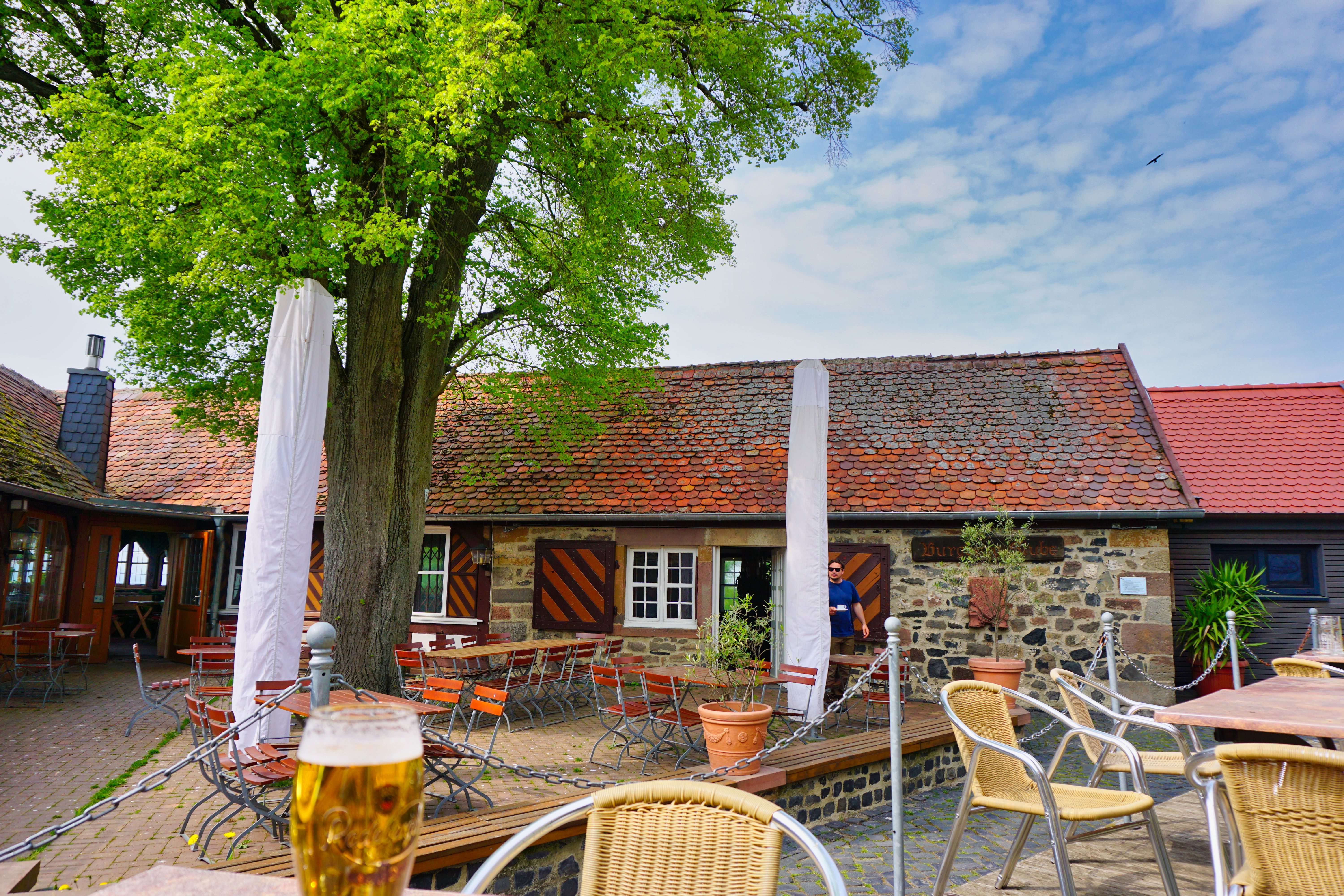 Vorburg mit Biergarten der Burg Homberg (Efze).