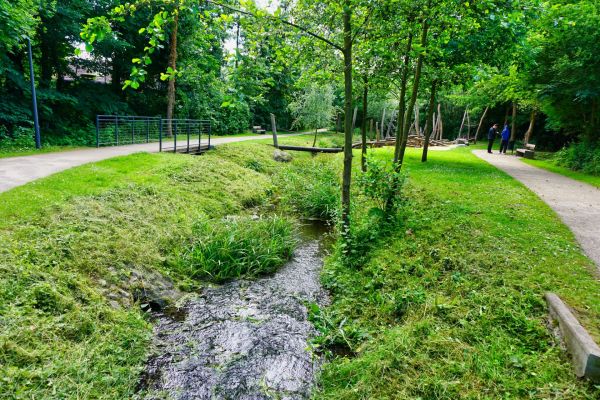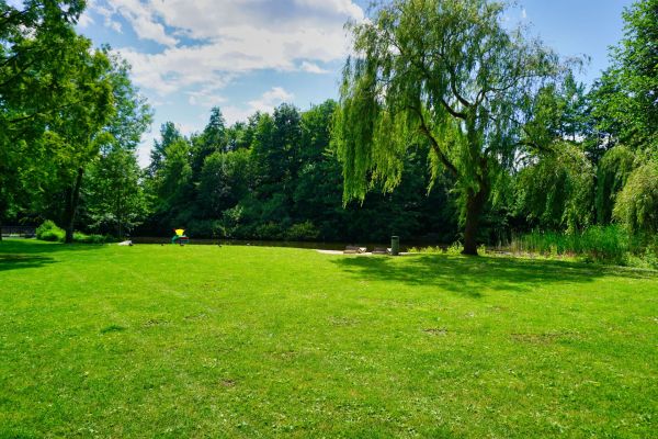 Der Teich wird durch den Pulverbach, welcher durch den gepflegten Park führt, gespeist.
