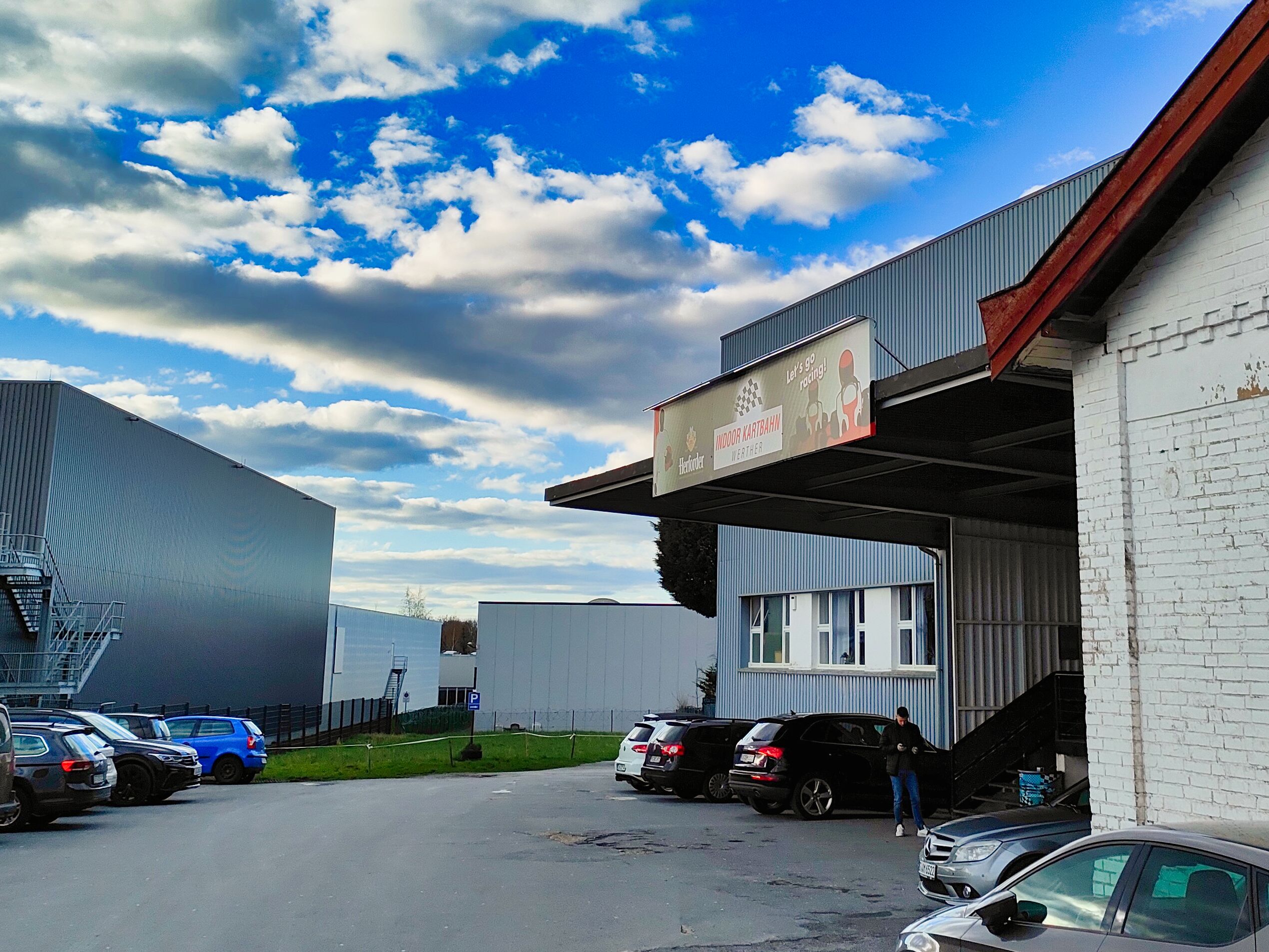 Einfahrt und Parkplätze der Indoor Kartbahn, Werther.
