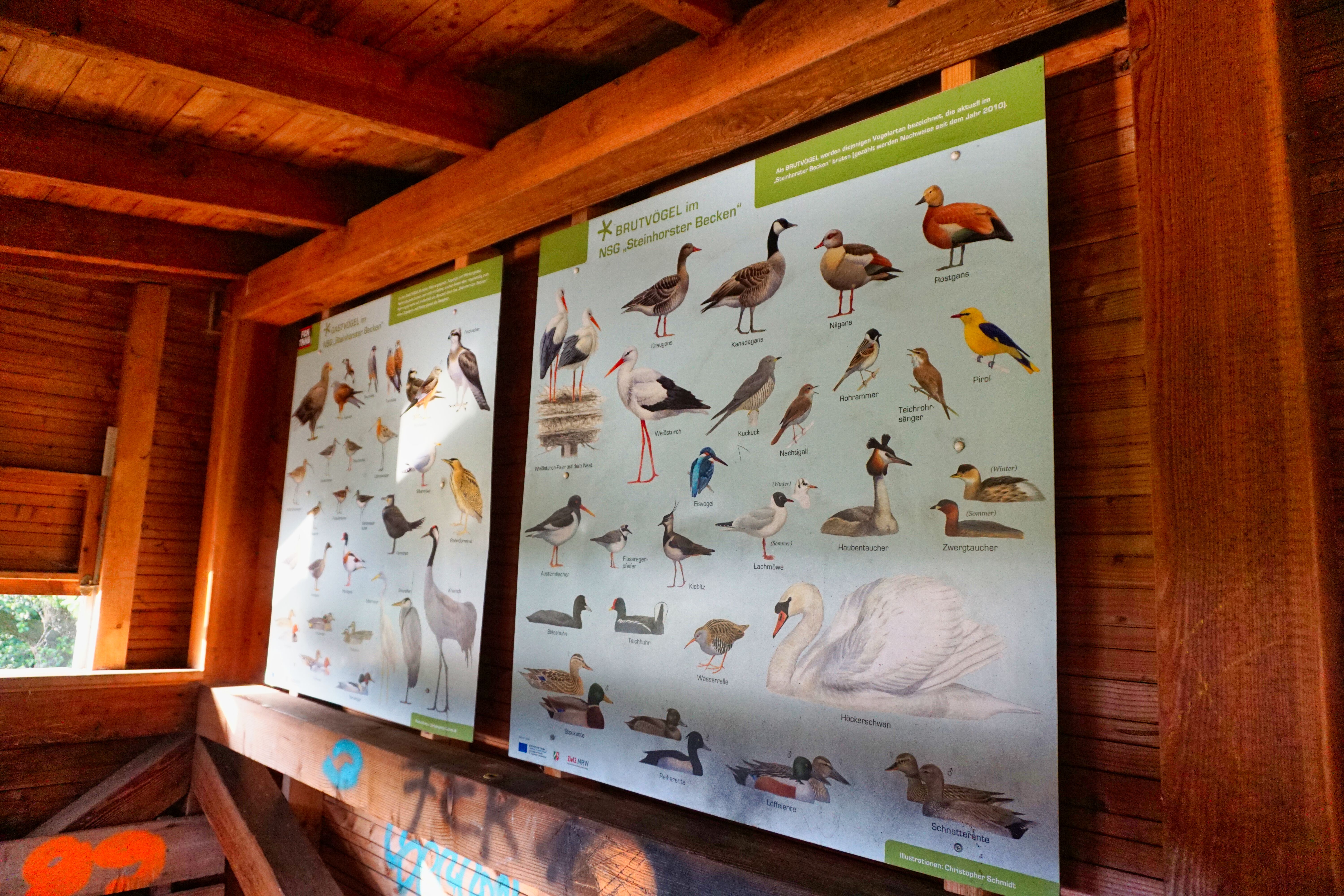 Innenansicht mit Info-Tafeln im Aussichtsturm Steinhorster Becken.