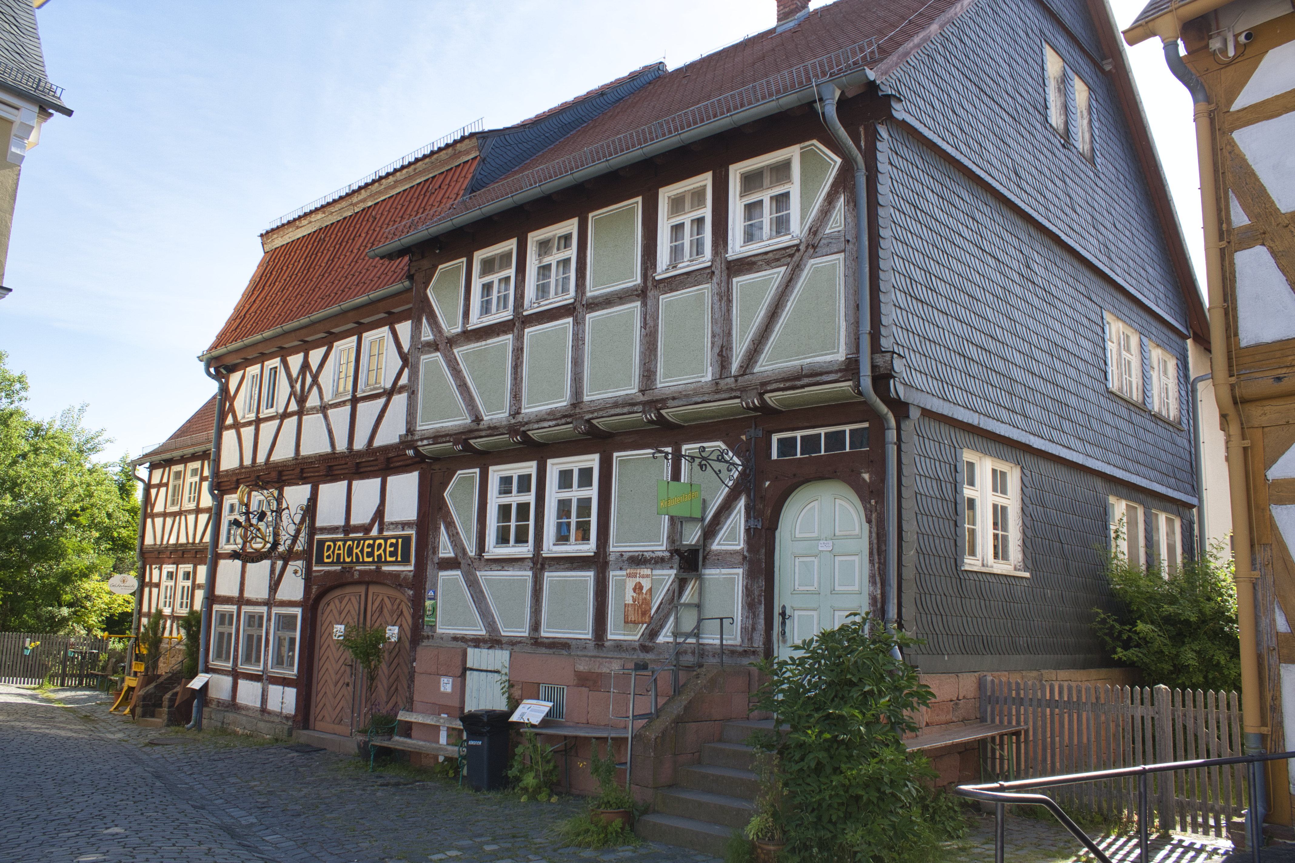 Bäckerei (Haus aus Hessisch Lichtenau) und Kräuterladen (Haus aus Messel, Goldschmiede) im Freilichtmuseum Hessenpark in Neu-Anspach.