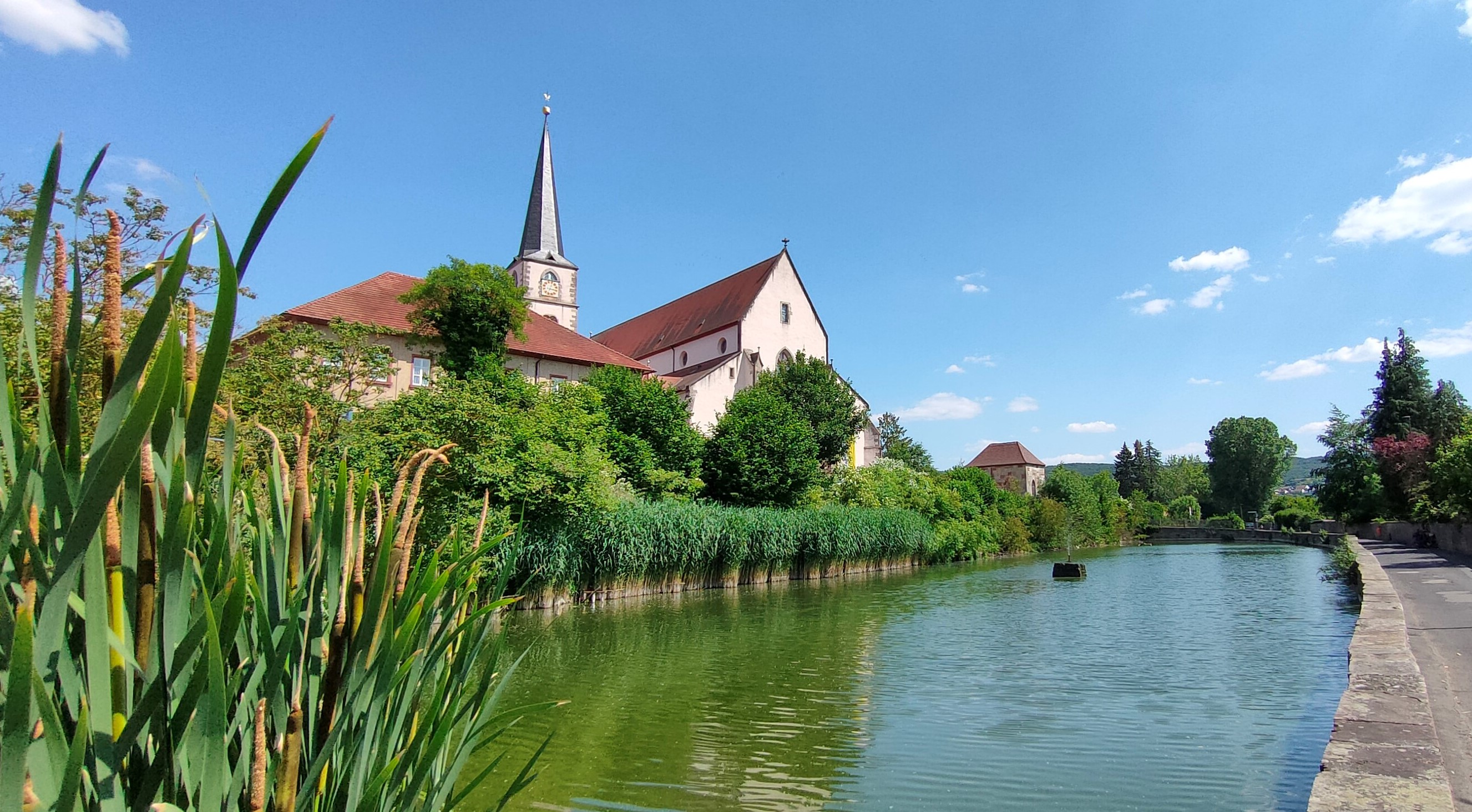 Die Kirche St. Johannes der Täufer mit der Ölbergkapelle und dem Hammelburger Weiher.