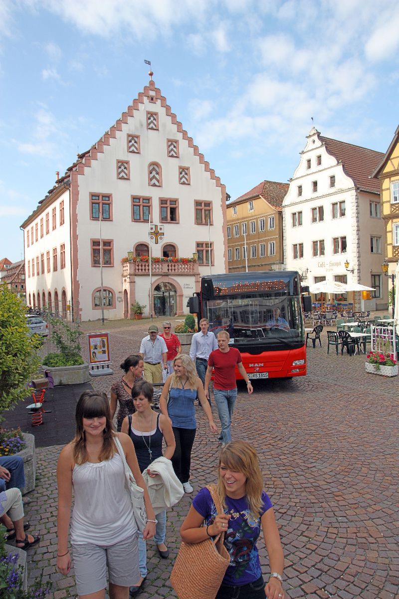 Stadtbus und Rathaus von Bad Mergentheim.