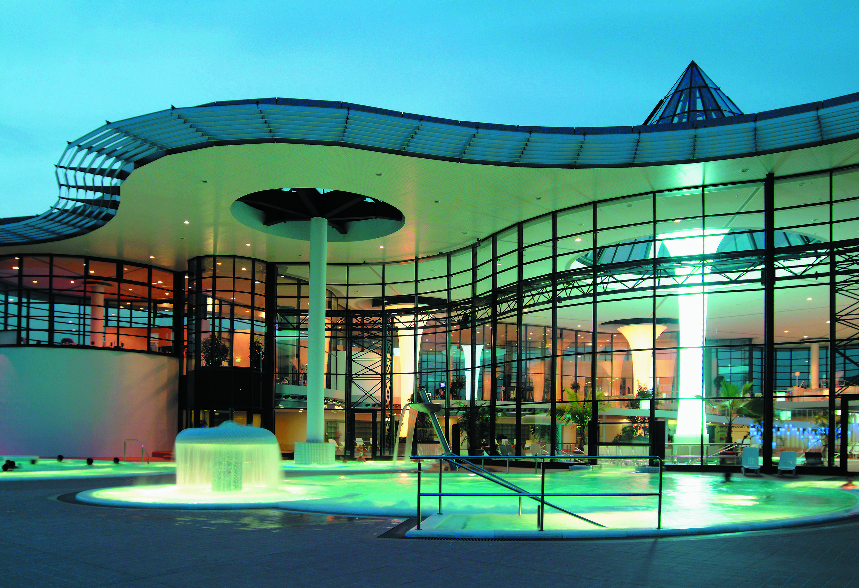 Integriertes Licht in den Säulen und außergewöhnliche Licht-Formen setzen die ThermenLandschaft, vor allem am Abend, stimmungsvoll in Szene.