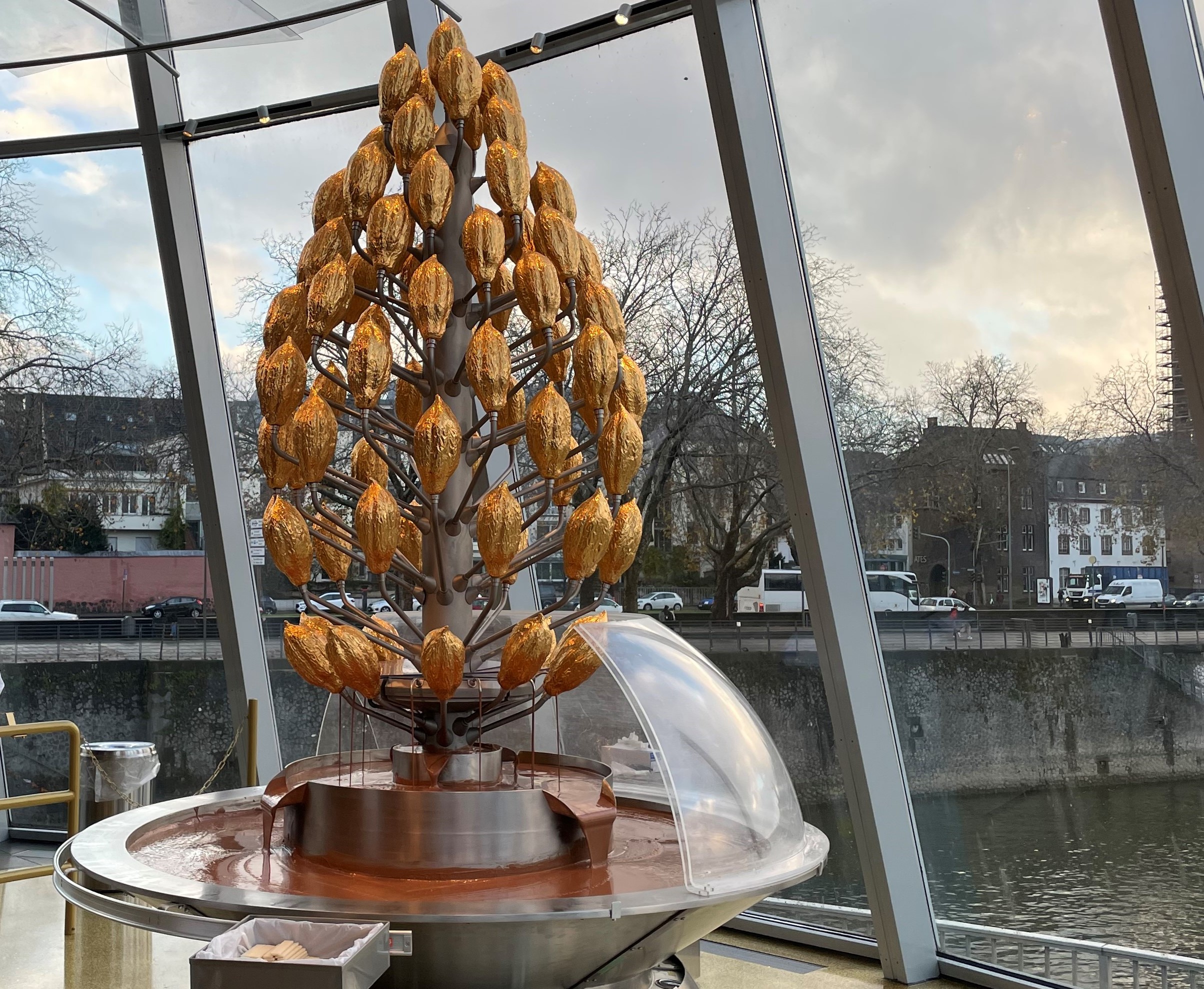 Das Wahrzeichen des Schokoladenmuseums ist rund 3m hoch und wird stets von freundlichen Mitarbeiter/innen des Museums betreut u.a. zur Ausgabe von leckeren Gebäck - jeweils mit Schokoladenüberzug des Brunnens.