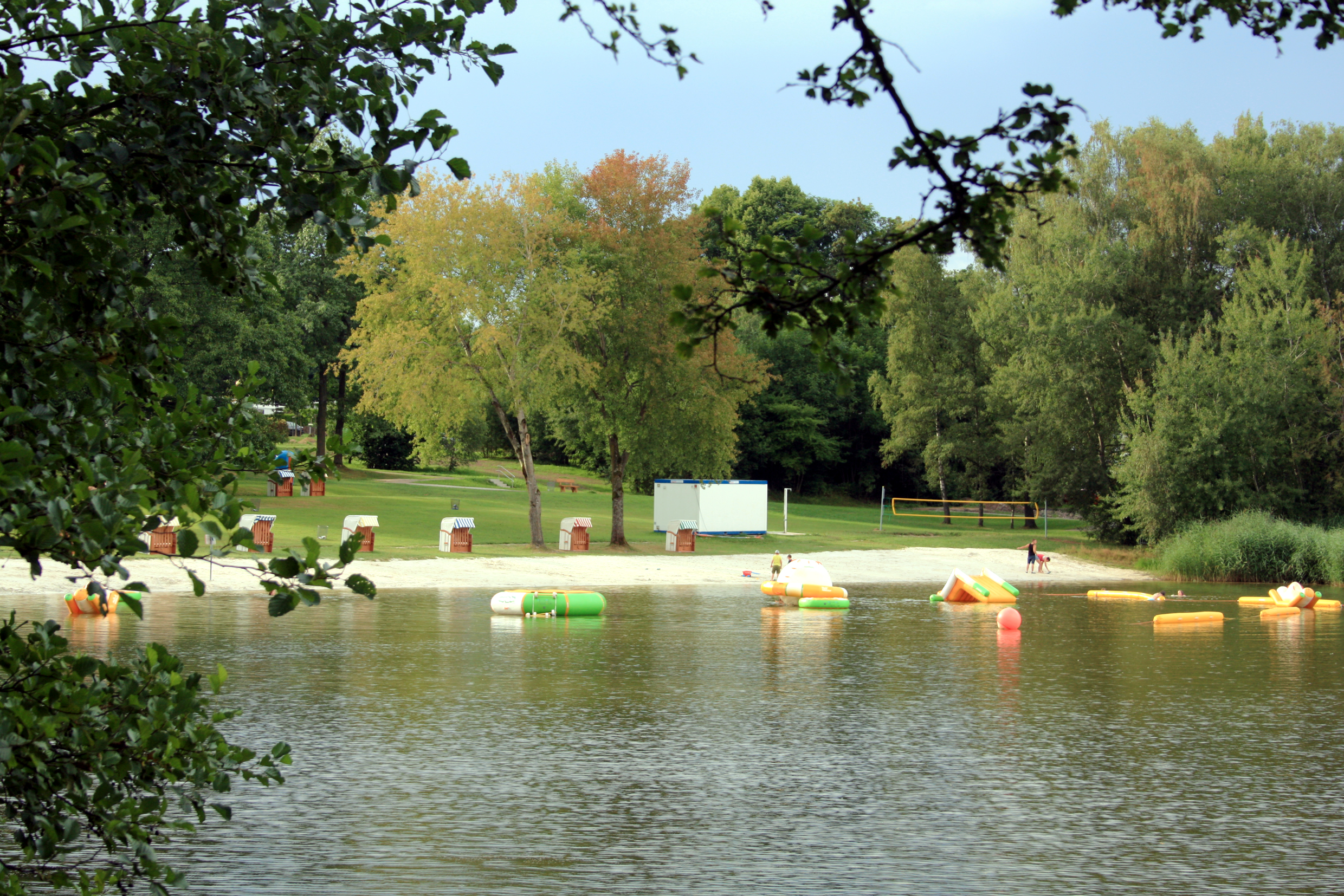 Mit Beachvolleyball-Feld, Strandkörben, Luftkissen im Wasser und vielem mehr.