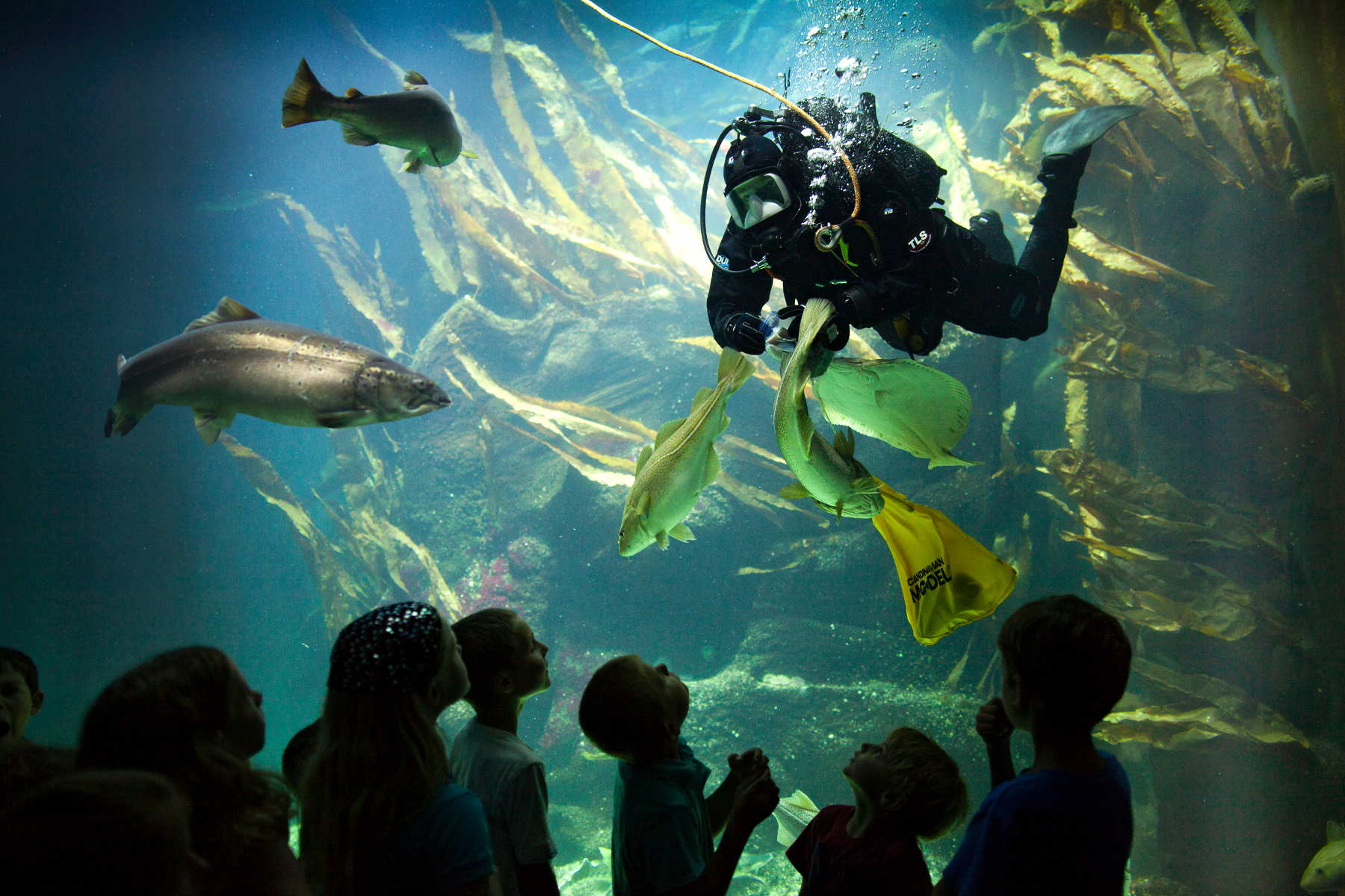 Einer der Höhepunkte in der Unterwasserwelt des Multimar Wattforum ist der Taucher, der die Fischschwärme im Großaquarium füttert.