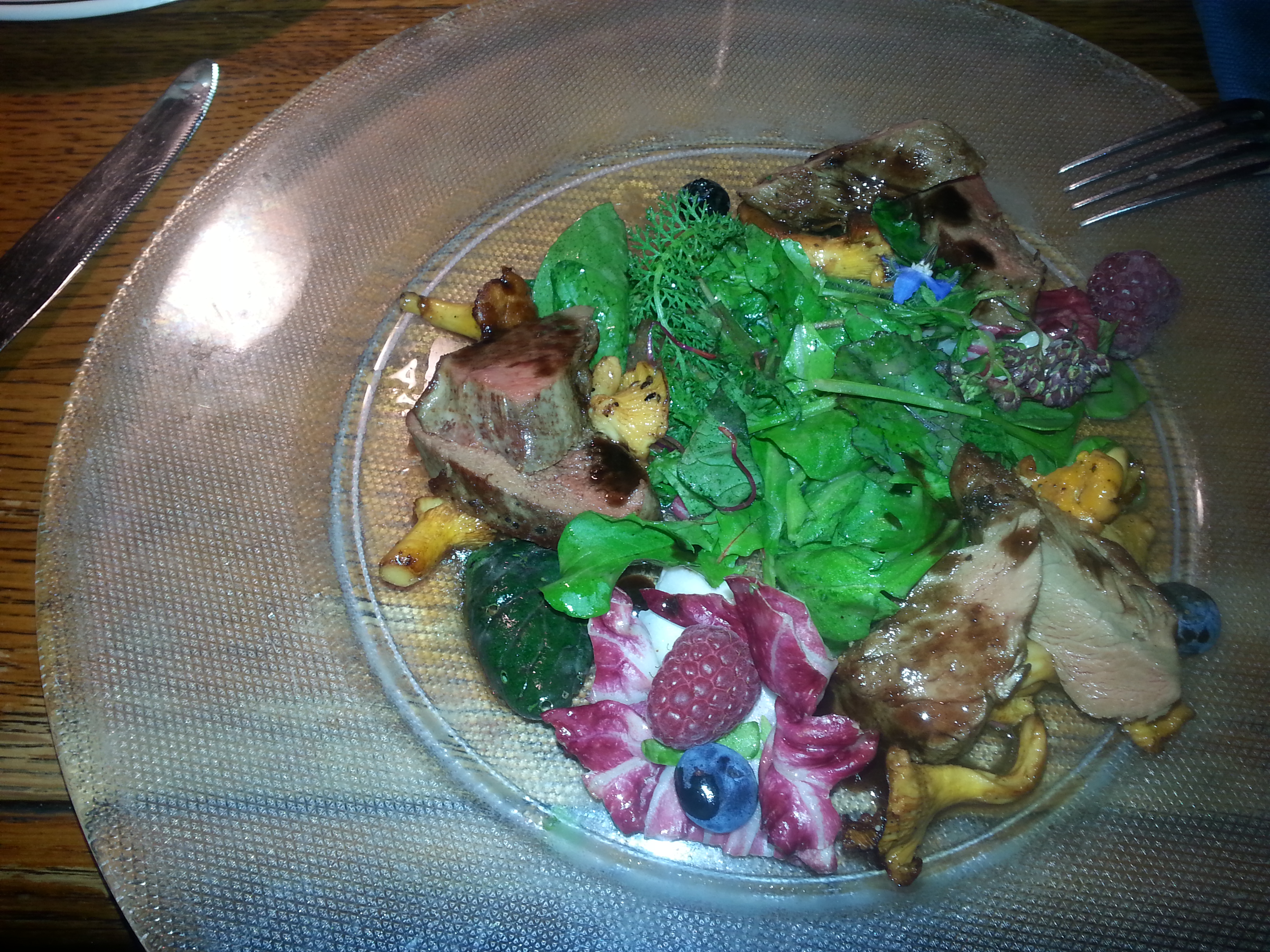 Wildkräutersalat mit Rehfilet im Wirtshaus Linde, Herbstein / OT Altenschlirf.