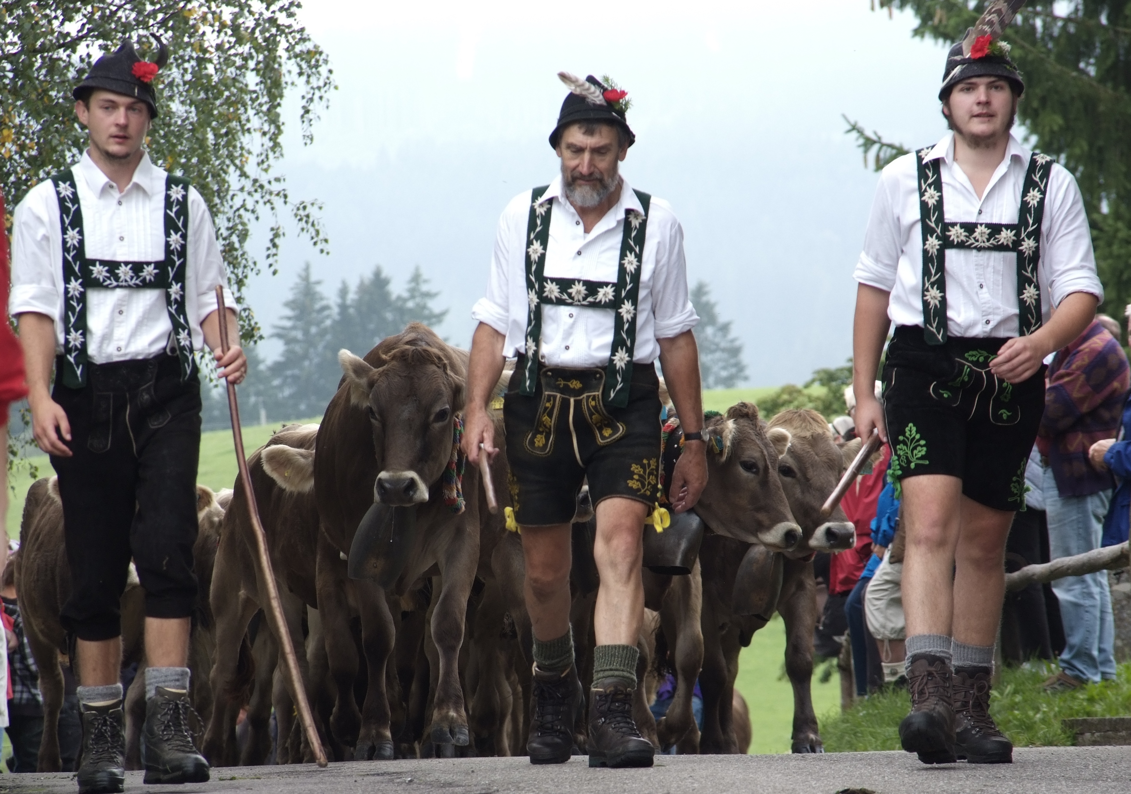 In den traditionellen Trachten führen die hiesigen Landwirte Ihre Kühe auf die Wiesen.