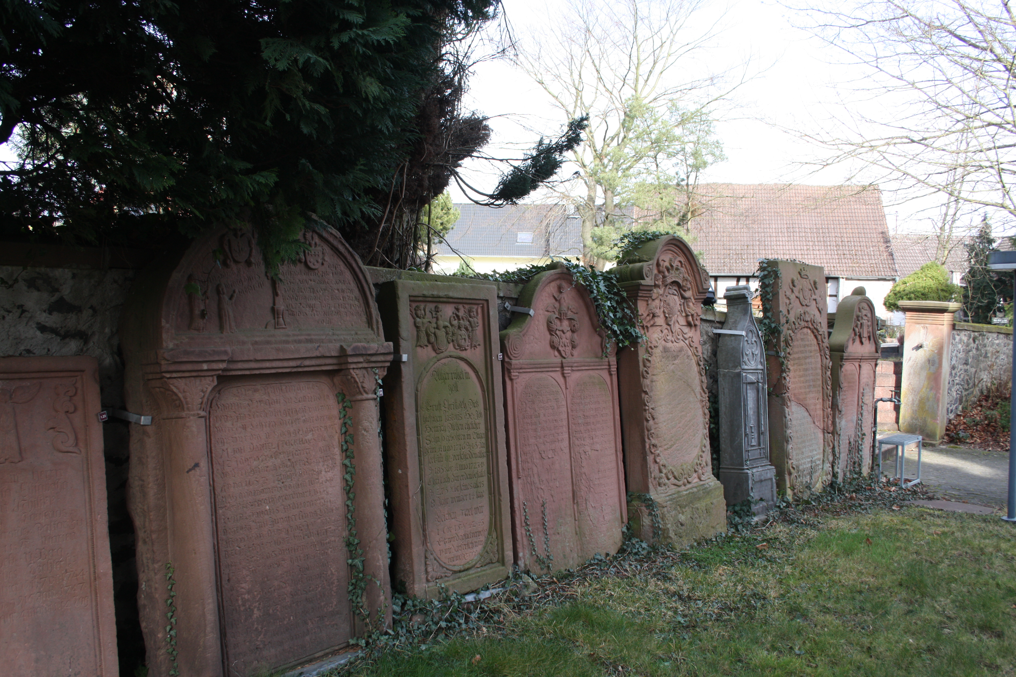 Barocke Grabsteine bei der Kirche Dauernheim.