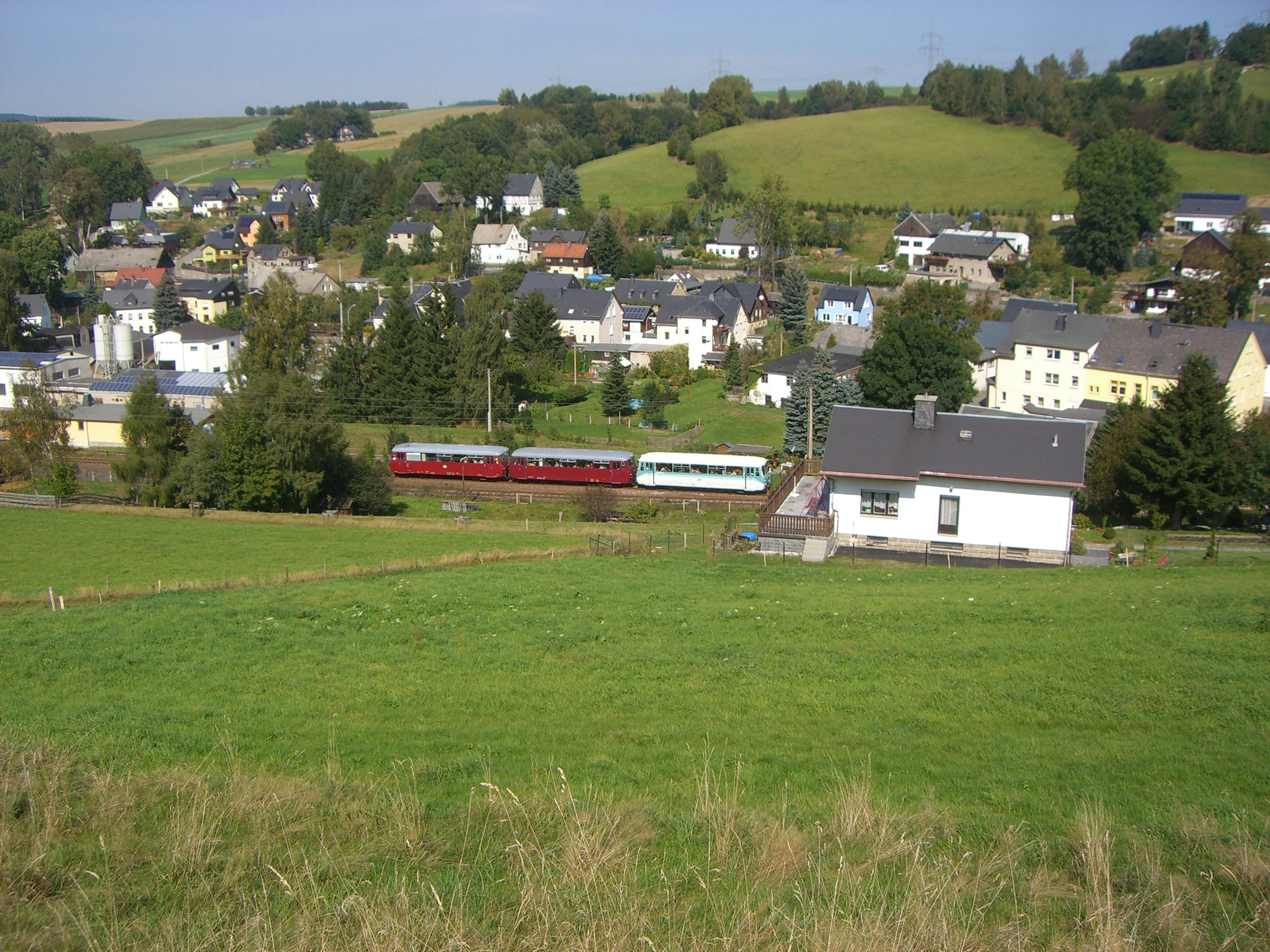 Die Triebwagen der Erzgebirgischen Aussichtsbahn durchfahren die Ortslage von Markersbach auf ihrem Weg von Schwarzenberg nach Annaberg-Buchholz.