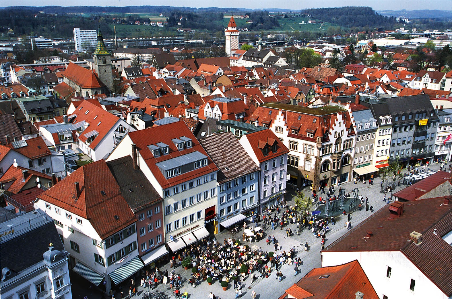 Lebendiges Zentrum Ravensburgs ist der Marienplatz. Mittelalterliche Häuser bilden die historische Kulisse für eine moderne und bewegte Stadt.