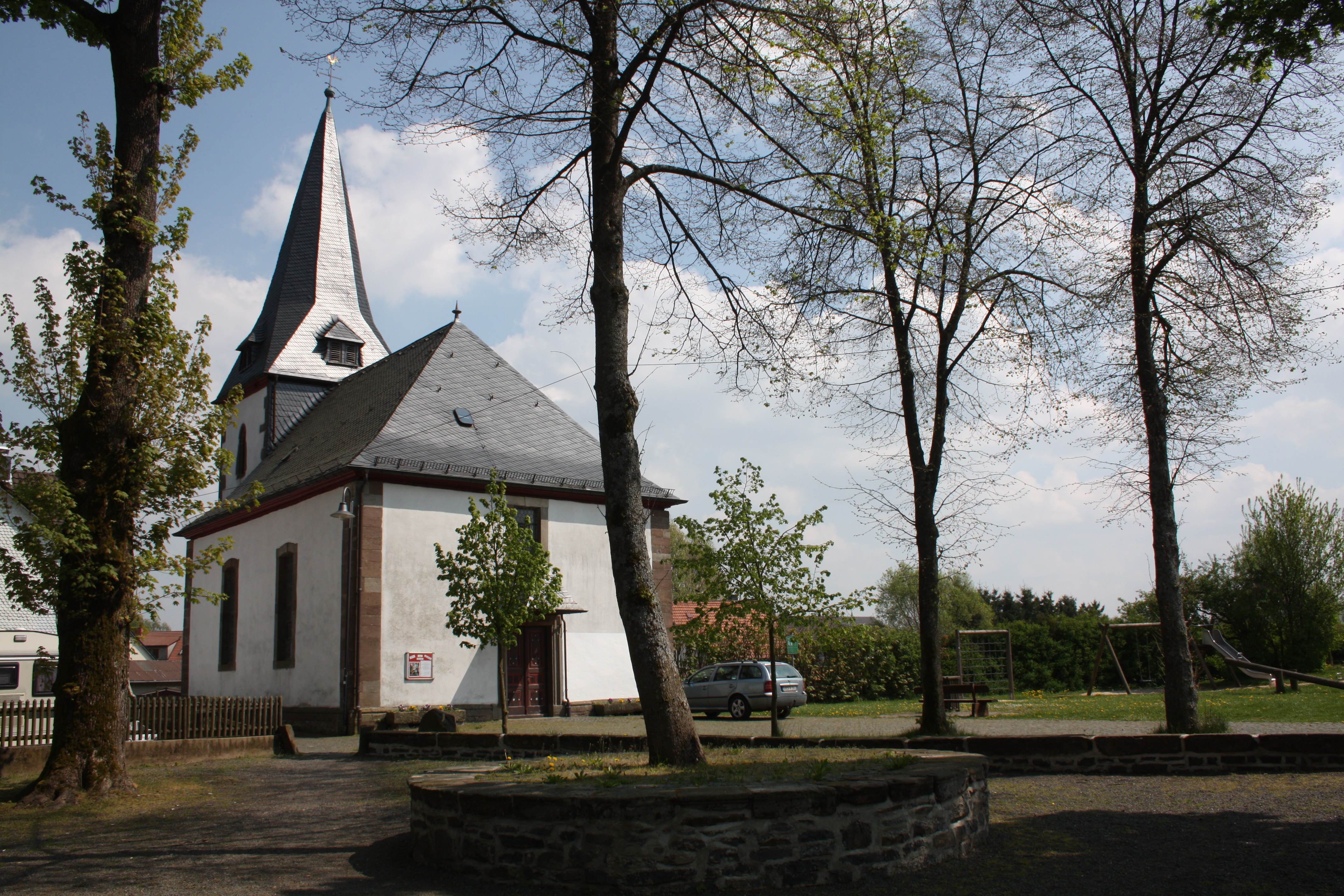 Dahinter die bereits im 14. Jahrhundert erbaute Steinkirche.