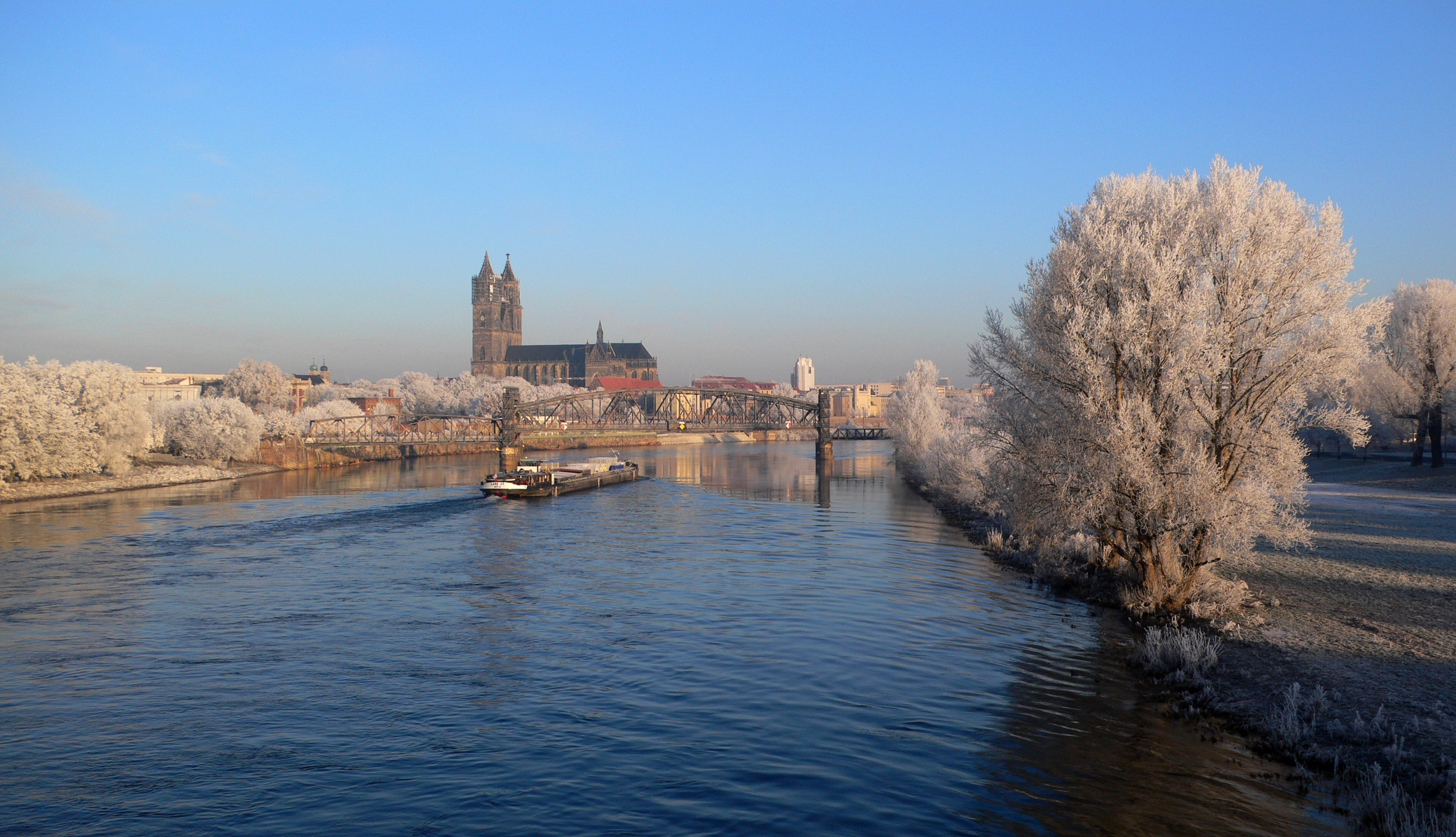 Der Magdeburger Dom mit Elbe zur Winterzeit.