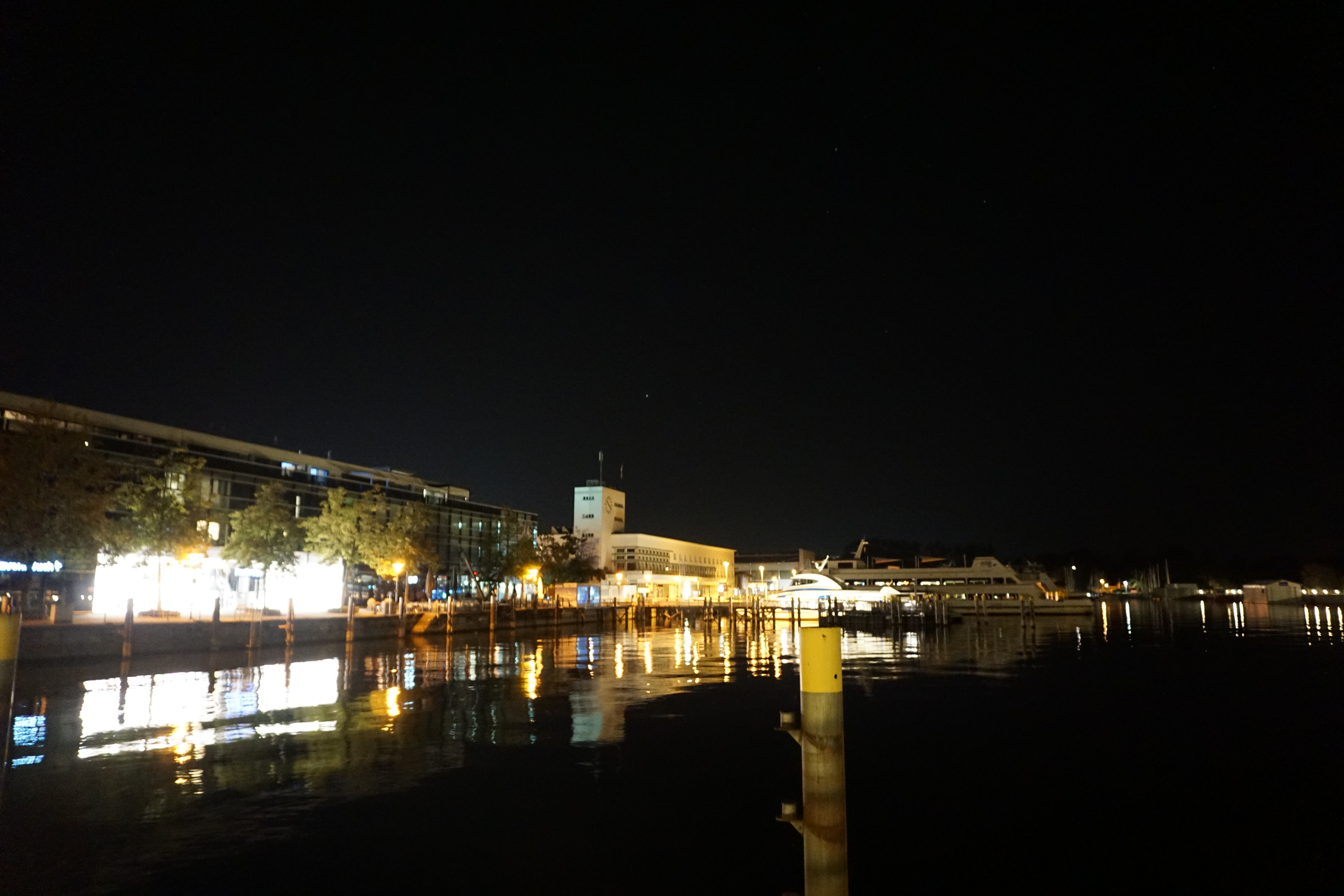 Hafen von Friedrichshafen bei Nacht.