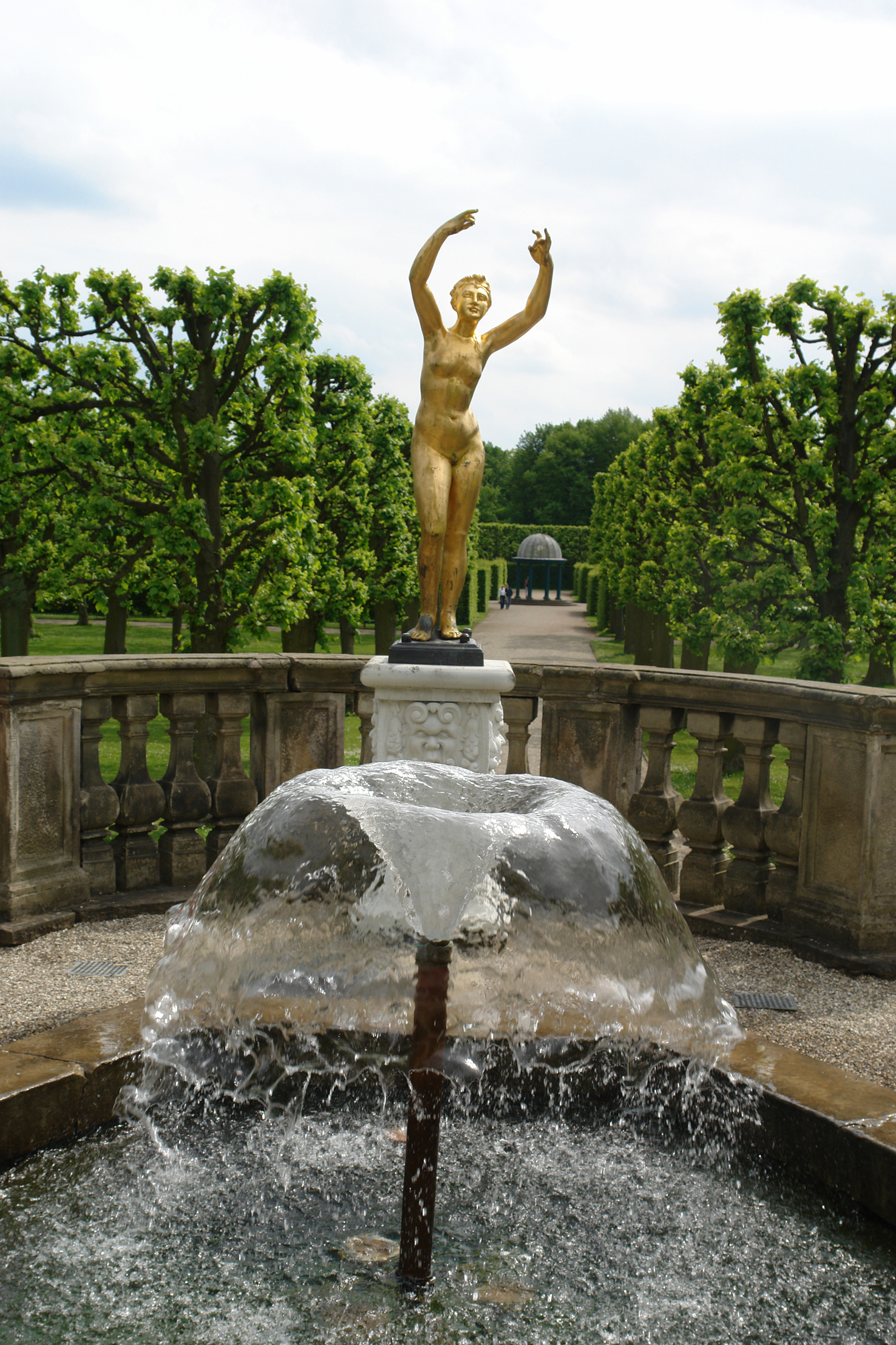 Wasserspiele und goldene Statue in den Herrenhäuser Gärten Hannover.